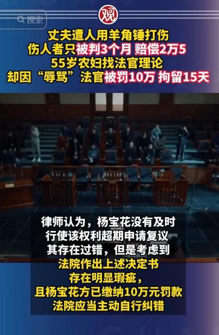 山东临沂,5旬女子的丈夫与邻居发生争执,被邻居用羊角锤打伤,伤情达到轻伤二级。后邻居被判拘役3个月,并赔偿女子丈夫2.5万余元。然而女子认为法院判得太轻,于是在庭审结束后,在法院内大声指责法官没有良心。结果女子因此被司法拘留了15日,罚款10万元。 (信息来源:观察者网 2025年9月16日) 2023年翟某(化名)在家闲着没事干,于是就上大街上和邻居闲聊,他们几个人围成一圈在大街聊的十分带劲,哄堂大笑,然而就在他们讨论一件事情的时候画风突然就转变了。 当时翟某和高某(化名)再说村子里面有一户人家的家庭纠纷,两人持不同的意见,所以两人互不相让发生了口角争执,随后经过激烈的争吵之后,高某的脾气一下子就上来了。 随后直接拿着羊角锤抡在了翟某的身上,抡下去的瞬间翟某身上就流了很多血,见状之后立马就给翟某的妻子王某(化名)打了电话,紧接着翟某就被送去了医院。 到医院之后经医生检查之后虽然没有造成生命危险但还是需要住院观察几天,等翟某的情况稳定之后立马就报了警察,希望警察来处理这件事情。 随后经过对翟某的伤情鉴定,发现他的伤情已经算是构成二级轻伤了,于2025年6月3日法院做出了判决,因高某的行为造成了翟某的各项损伤,但两发生争执的时候翟某也有错,所以最后判决高某除了刑事拘留三个月外在赔偿两万三千余元。 面对这样的判决翟某的妻子很是不满意,觉得判的太轻了,于是就妻子就去到了法院的大厅里面找事情,她大声嚷嚷之后看见并没有起到什么作用。 随后她就直接在大厅里面喊,说是那个每两人的“东西”给丈夫的案件判定的,太不公平了,王某本想着想要凭借自己的这一闹之后让法院重新判决,不料却给自己惹来了祸端。 随后她的女儿缴纳了罚款,通过这件事情告诉我们在我们不满意判决之后可以在根据自己的诉求提起诉讼,但一定不要瞎胡闹,因为法院看中的就是法律法规和公平正义。 面对这样的事情,你还有什么想说的吗?