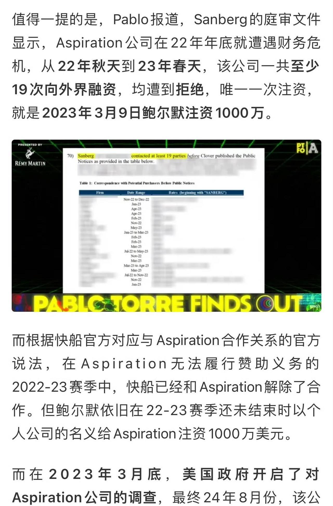 关于昨天爆料者Pablo Torre播客最新的爆料图1图2,库班再次给出回应! 简而言之,库班的反驳观点是:这看起来不像是球队老板精心策划的工资帽阴谋,而更像是一场以桑伯格为核心的行动——目的是推动一项并购交易,并在业务濒临崩溃的情况下营造营收假象。 更深入地说,库班的论点包含以下几点: 1. 他认为托雷(Torre)追踪的方向有误。库班表示,鲍尔默(Ballmer)那笔5000万美元的投资,以及丹尼斯王(Wong)分别投入的200万美元和1000万美元,根本就不是流向科怀(Kawhi)的资金;托雷是把“日期相近”误认为了“存在因果关系”。 2. 在库班看来,季度合同款项的到账时间往往与融资交割时间相近,因此仅凭时间戳吻合,并不能证明存在向球员付款的意图。 3. 他重新解释了资金流向与Aspiration公司碳信用业务的关联:碳信用通常是预先付款,待验证后再交付,因此注入的资金会用于购买或发起碳信用、扩大销售额。库班指出,若有人真想套现给科怀,最简单的方式应该是更大力地依靠那些“几乎全是利润”的碳信用——而他称,桑伯格与其他合作方的操作似乎正是如此,目的是制造营收假象,而非构建一条“从快船队到科怀”的资金通道。 库班还对消息来源提出了质疑: 此外,库班还将视角从体育领域扩大到了证券领域:
