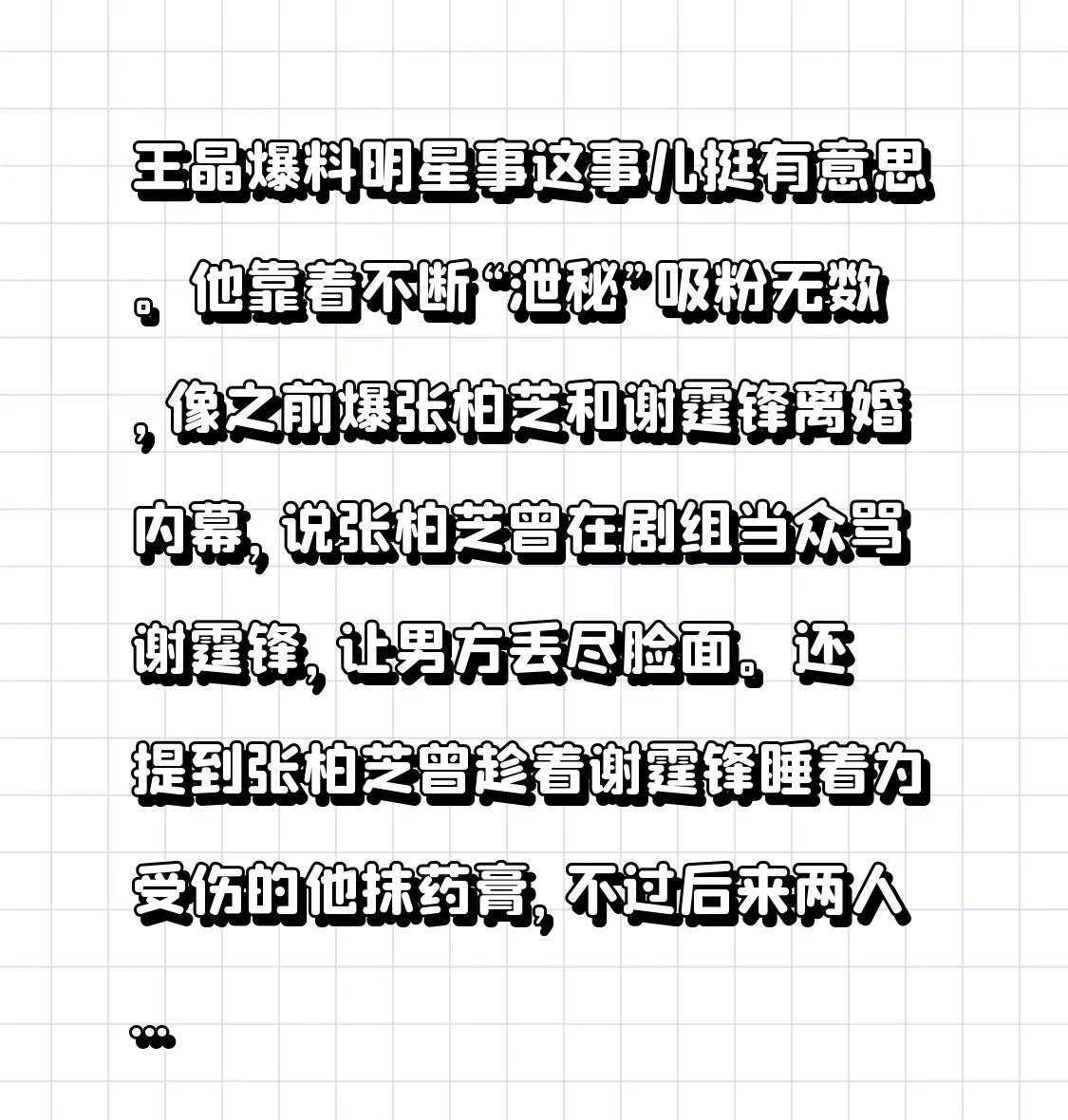 王晶爆料明星事这事儿挺有意思。他靠着不断“泄秘”吸粉无数,像之前爆张柏芝和谢霆锋离婚内幕,说张柏芝曾在剧组当众骂谢霆锋,让男方丢尽脸面。还提到张柏芝曾趁着谢霆锋睡着为受伤的他抹药膏,不过后来两人矛盾渐生。从他的爆料里,能看到明星生活里不为人知的一面,满足了大众的好奇心。 但他也有翻车的时候,5月20日暗指温兆伦,被温兆伦怒怼揭旧伤,网友都说他这次踢到铁板了。看来爆料这事也得悠着点,不然容易引火烧身。不过对咱吃瓜群众来说,有料可看就挺乐呵。