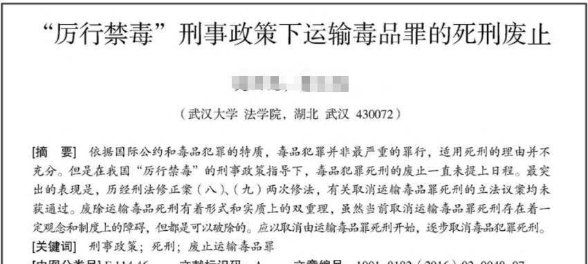 除了这类男女对立话题外,也有很多自由派论文。 比如,该大学法学院的一篇《动物权利论析》里,说“(药物)毒性测试也没有任何必要在动物身上进行实验”。 那我就想问问,药物不先拿动物实验,难道直接在人身上实验吗? 还有,该论文将狗和“脑瘫婴儿”拿来对比,反驳“认为脑瘫婴儿拥有道德权利而狗不能够拥有道德权利的观点”,从而论述动物也应该拥有一定的道德权利。 这个论文也挺离谱的,动物是否应该拥有一定的道德权利,这个话题可以另说,但他这个论述过程是相当荒谬的。 拿脑瘫婴儿跟狗对比,本身就是很离谱的事情。 能在论文里这样公然歧视脑瘫婴儿,就很离谱,作者感觉都没搞清楚“脑瘫”是什么。 而且,狗是不是应该有一定的道德权利,这个更多只是狗主人的个人选择,有人把宠物当做自己小孩来养,那么他自然会赋予自己宠物一定的道德权利。 但这种个人行为,绝不能上升到立法层面,变成要在法律层面去推动给动物一定的道德权利,那就有问题。 而且,这种个人赋予宠物的道德权利,是建立在不能损害他人利益的基础上。 比方说,他在家里想把自己养的狗当小孩养,是他的自由,但他把狗带出去,就得牵狗绳,否则就是违法行为,狗咬了别人,他就要为此负责。 这种自由,是有边界的。 而在自由派的思想里,他们所提倡的自由,是没有边界的,而且他们的自由,往往是以侵犯他人利益来实现的自由,这也是为什么大多数自由派往往是精致利己主义。 这也是典型的西方白左价值观,是典型的意识形态渗透案例。 还有该大学法学院,还出过一篇论文标题是《“厉行禁毒”刑事政策下运输毒品罪的死刑废止》。 关键词里,甚至还有“废止运输毒品罪”。 国内司法领域,废死派,跟西方自由派是有高度关联,基本跟西方白左价值观绑定。