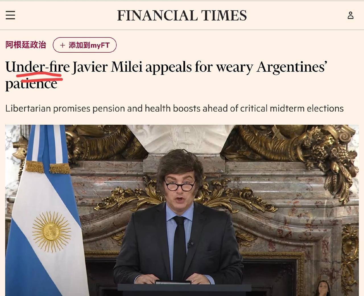 连西方主流媒体也吹不动米莱,风向开始逆转。 英国FT:米莱首次让阿根廷央行出手干预高速下坠的比索(阿根廷法币)——因为米莱已经实在顶不住压力,出手救垂直下落的比索价格。明年阿根廷即将到期数十亿美元的主权债务,到时候可以预计米莱根本无法偿还。更别提阿根廷内部的经济问题,已经怨声载道。 FT文章上充满了危机(crisis)、遭遇抨击(under fire)、路途艰辛(the hardest)等用辞,和之前的力捧大相径庭。米莱的最新讲话中,也已经开始使用【要耐心】,【现在的困难是计划的一部分】……阿根廷人民好在比较心善,万一真愿意再忍他个几年呢?