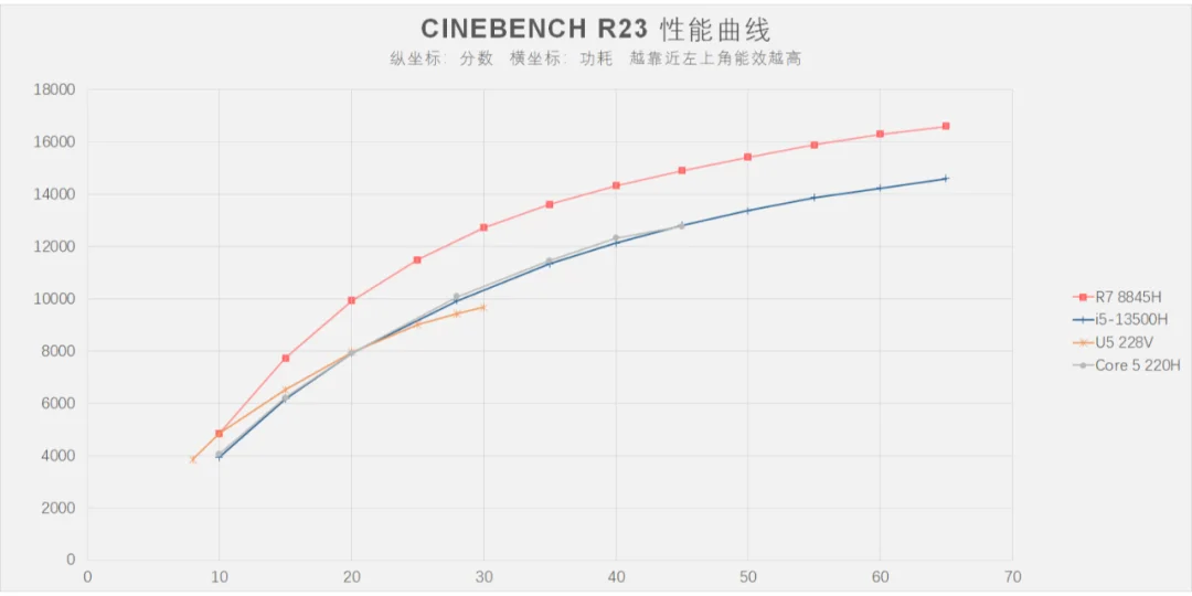 这颗酷睿 5 220H的理论性能和i5-13500H在45W内几乎完全一样,它们的能效表现几乎重合,酷睿 5 220H说是i5-13500H的超频马甲也不为过。(如图5)[偷笑R]