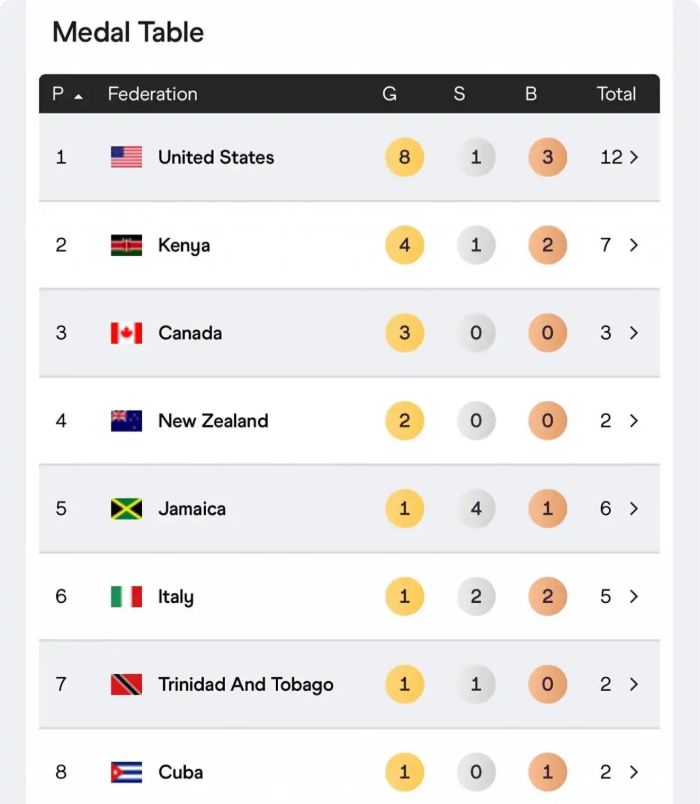 1,美国———8金1银3铜—12枚奖牌 2,肯尼亚——4金1银2铜—7枚奖牌 3,加拿大——3金0银0铜—3枚奖牌 4,新西兰——2金0银0铜—2枚奖牌 5,牙买加——1金4银1铜—6枚奖牌 6,意大利——1金2银2铜—5枚奖牌 7.特立尼达和多巴哥-1金1银-2枚奖牌 8,古巴—1金1铜—累计2枚奖牌 8,瑞典—1金1铜—累计2枚奖牌 8,博茨瓦纳—1金1铜—累计2枚奖牌