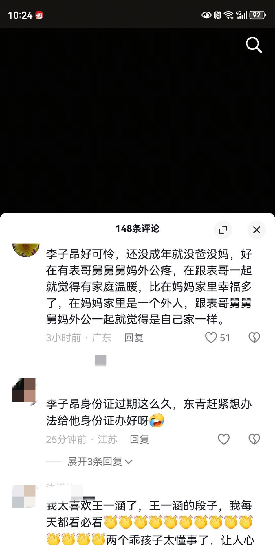 二姐大儿子生病了,身边只有表哥王一涵陪同。 换季了,天气时冷时热,李子昂住在舅舅新家,大双炒了腊肉,饭后李子昂表示他不舒服,要去医院看病,王一涵陪同。他俩是难兄难弟,王一涵透露,之前他生病也是李子昂陪同,输液陪了他几个小时 ,看来他们家的大人啥时候都是缺席的,只能孩子抱团取暖。正准备输液,二姐打去视频表示关心,应该是弟弟弟媳告诉他孩子去医院了,要不她隔那么远也不知道的。 都说有了后妈就有后爸,他这有了后爸也就有了后妈,之前跟着亲妈好好的,小继父回来时他那么巴结,用私房钱请他吃拉面,结果还是没能容下他。其实,既然在家里二姐做不了主,就不该去招惹孩子,人家在爷爷奶奶家里待得好好的,她名义上为了孩子,给他母爱,实际是给她立人设。把孩子带现夫家两年,小老公一回来就弄出去了,让孩子爷奶家不想回去,爸爸家也去不了,变得无所适从。其实,他要是个女儿,在二姐家待下去的希望可能还大一点儿,像叶子那样,可他偏偏不是。评论区留言都是觉得这娃现在上不得,下不得,人也还贪玩不懂事,就只能窝在舅舅家颓废度日,可怜!