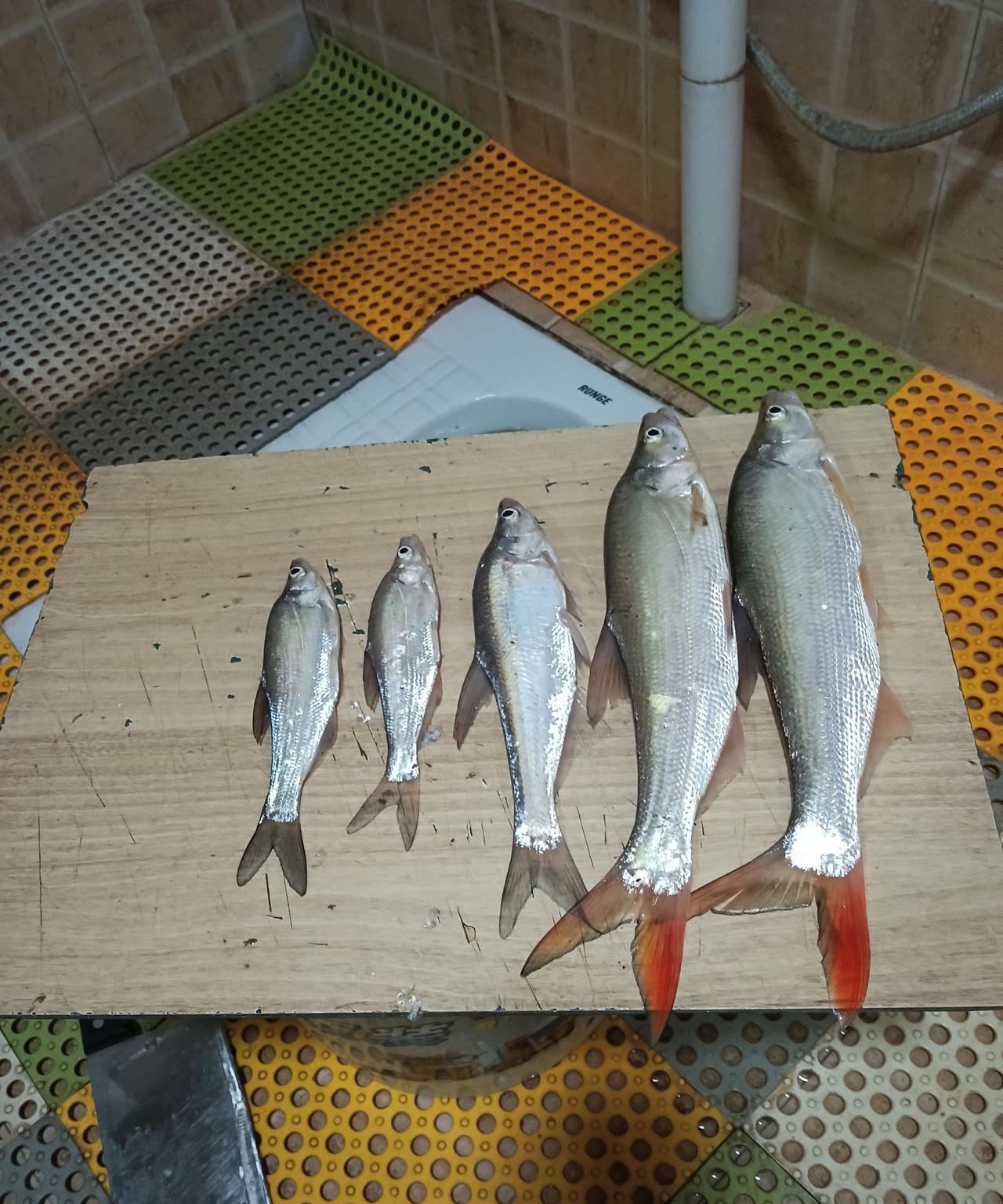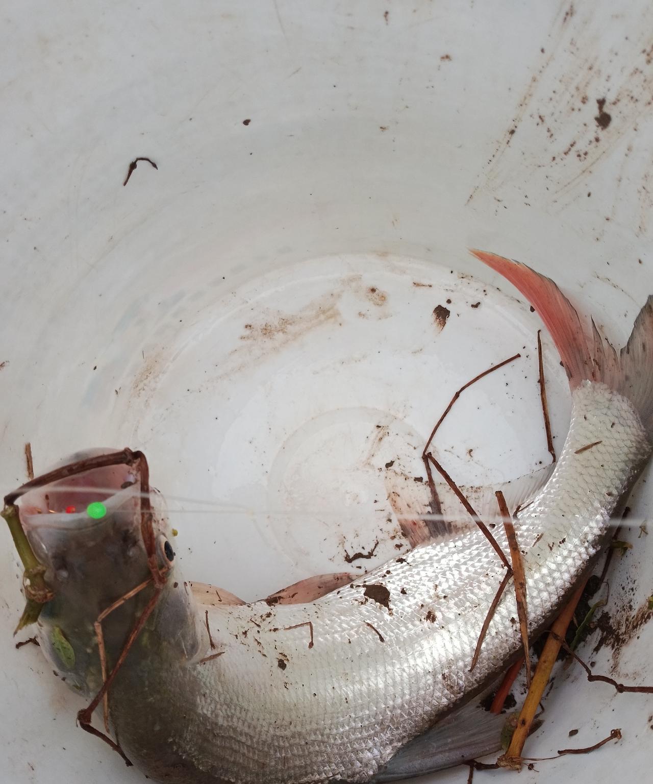 先到第一标点,湖北省荆州市沙市区沙北排渠荆州一医北院门口。本来打到了一条红尾,还不小,拍了照,结果在岸上取钩时,那家伙顽命一弹腿,居然从塑料桶中跳出!然后三翻两滚就到了水边,还没等我反应过来,它已逃之夭夭! 之后一口都没有,遂转场至同渠的上游,也无口。 又转场至沙北水系之体育中心一带,不承想,还钓到了3条青稍,2条红尾,两条红尾差不多大小,三两左右。
