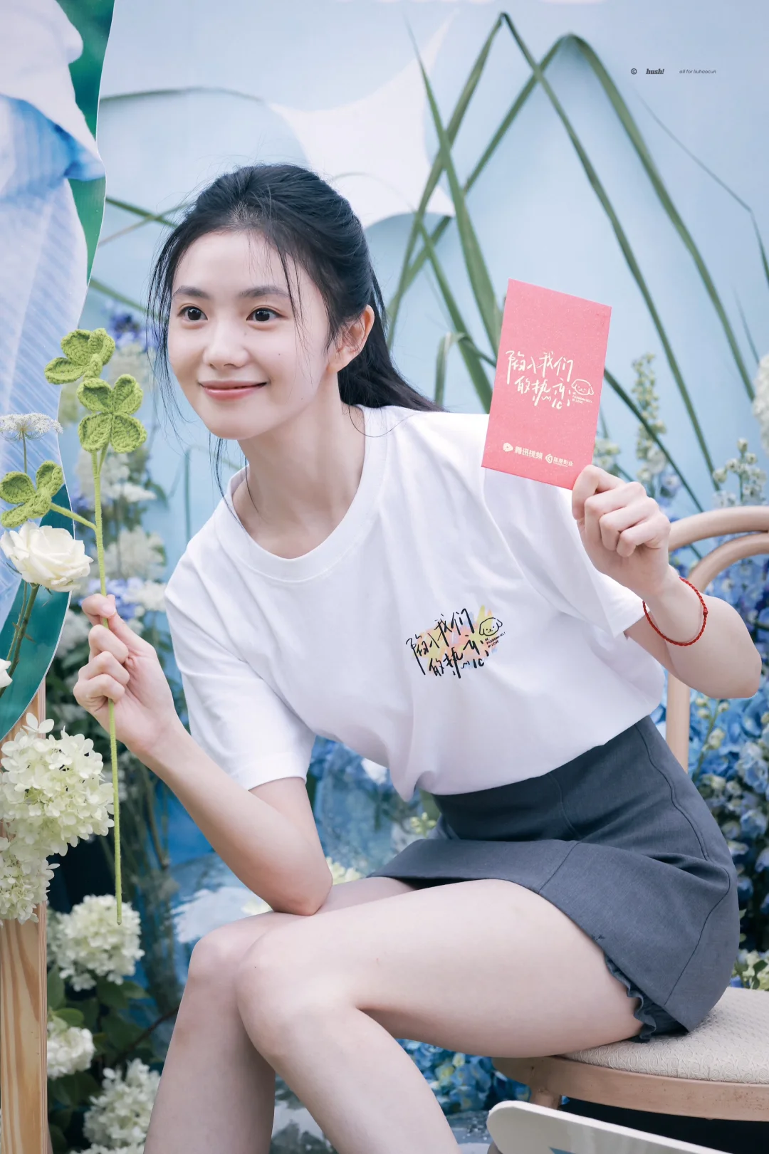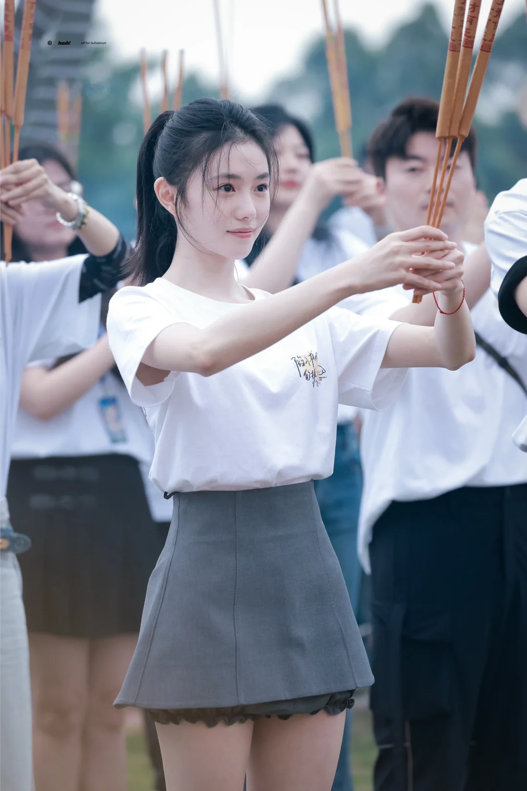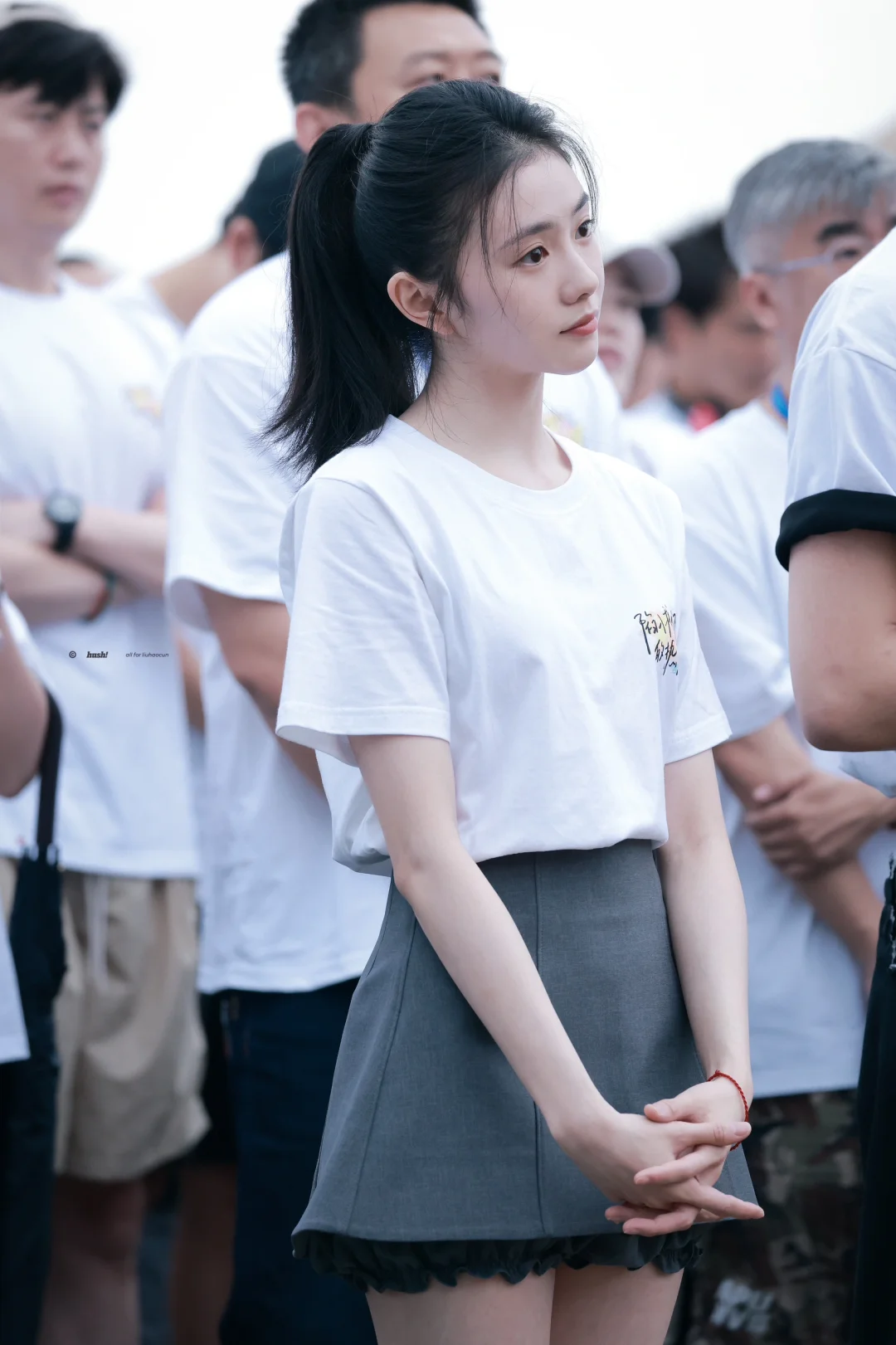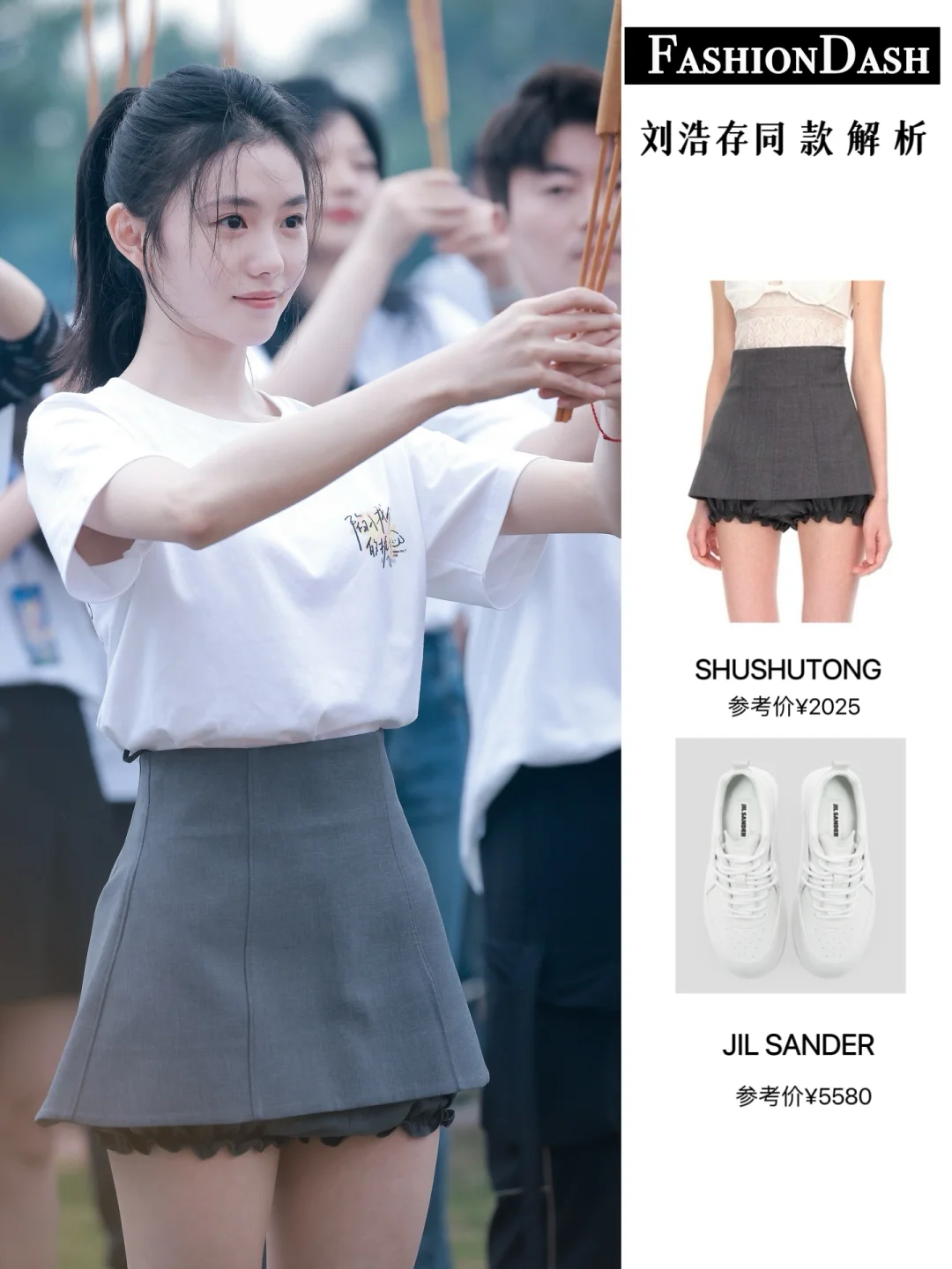 刘浩存今日开机穿搭,简单白T搭配灰色短裙,清爽又活力满满,这张脸真没话说!