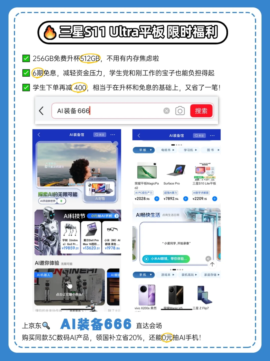上京东搜“AI装备666”,直达会场,购买同款3C数码AI产品,领国补立省20%,还能0元抽AI手机!趁活动赶紧冲,早买早享受~