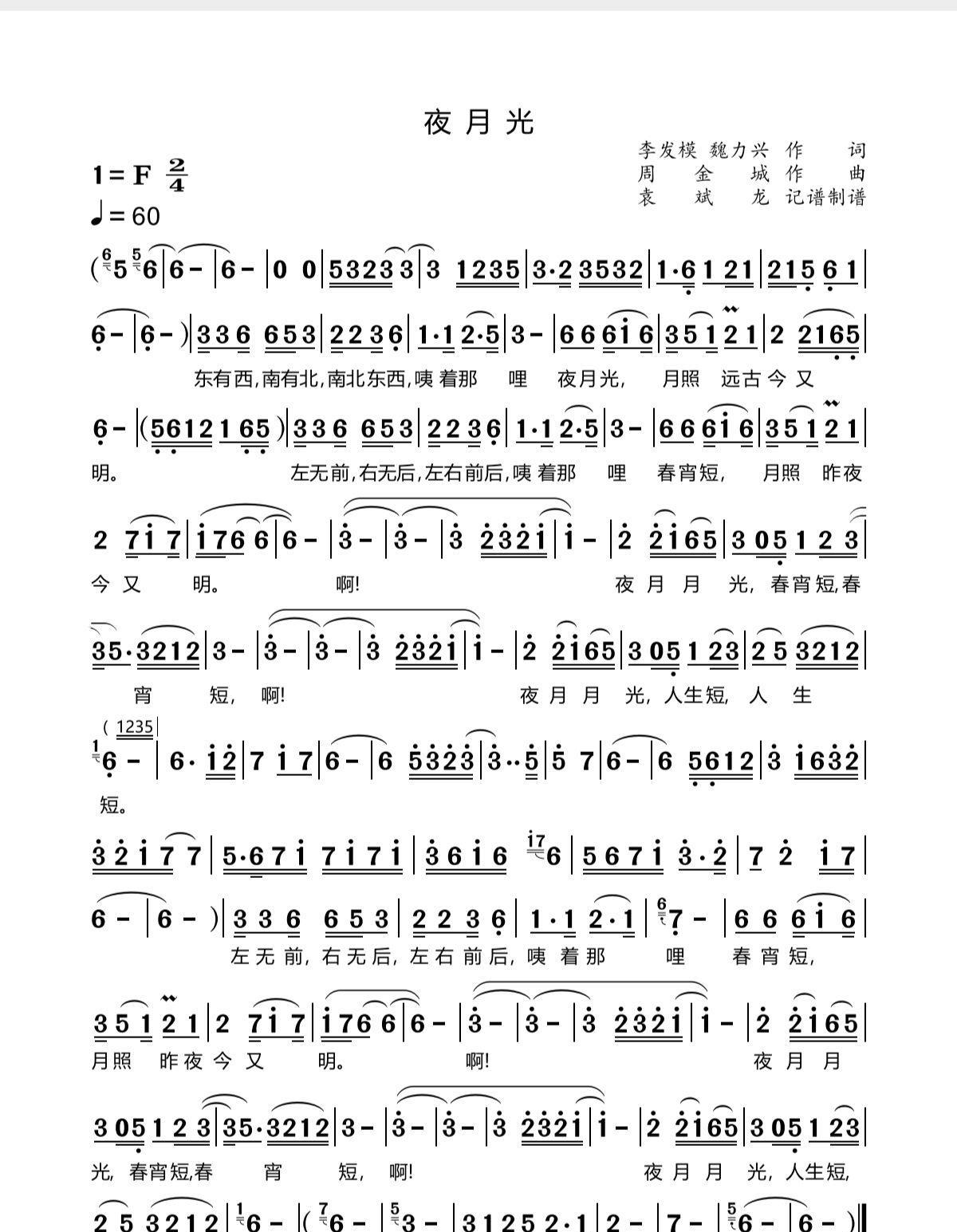 四川省“四川好人”袁斌龙老师,记谱制谱超高水准 一首《夜月光》的记谱制谱,见证了袁斌龙老师音乐才艺的厉害! “喜好文学艺术,坚信音乐益智、二胡怡情。”袁斌龙老师名不虚传。 袁老师的“谱曲于趣理念,记谱制谱于爱好。”更是让人大开眼界!再次表示感谢! 借此机会,感谢四川绵阳女歌手钟小琴的推荐,才有幸认识袁斌龙老师。 袁斌龙老师简介: 袁斌龙,男,中共党员,大专文化。1960年3月出生。先后在绵阳市安州区永河镇小学、河清镇小学和绵阳市沙汀实验中学任教。2021年2月退休。多年来,中小学音乐教育教学工作小有建树。曾获四川省“优秀少先队辅导员”、安州区“优秀党员”、四川省“四川好人”、安州区“首届助人为乐道德模范”等荣誉称号。喜好文学艺术,坚信音乐益智、二胡怡情,谱曲于趣理念,记谱制谱于爱好。其刊发教育教学及音乐原创作品30余篇(件、首)。退休后,曾任安州区文化馆花城乐队队长。现任安州区音乐舞蹈协会副主席。
