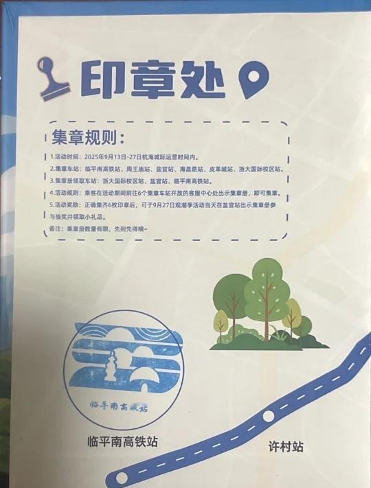 【集章篇】杭海城际绿色出行集章打卡活动 杭海城际2025年绿色出行集章打卡活动开始啦 ⏰活动时间:2025年9月13日-9月27日杭海城际运营时间内。 🕹集章车站:临平南高铁站、周王庙站、盐官站、海昌路站、皮革城站、浙大国际校区站。 📚集章册领取车站:浙大国际校区站、盐官站、临平南高铁站。 ⭕活动规则:乘客在活动期间前往6个集章车站开放的客服中心处出示集章册,即可集章。 💝活动奖励:正确集齐6枚印章后,可于9月27日观潮季活动当天在盐官站出示集章册参与抽奖并领取小礼品。 备注:集章册数量有限,先到先得哦~ 🎁奖品:杭海城际主题套盒冰箱贴、列车造型笔袋、折叠雨伞、环保帆布袋、防蚊贴等精美礼品 攻略:[一]集章册领取点浙大国际校区领取的人最多,如果有的话可以领取了逐一站点盖章,如果没有的话可以直接去盐官站或者临平站领取,先盖临平、周王庙和盐官三个站点的章再回来盖市区三个站点的章 [二]全程同一站点进出站,中途不出站的前提下,三小时内只需要2元即可我今天亲测了,浙大国际校区站领取盖章本开始逐一盖章,单程一个半小时,回来45分钟,完全在三小时范围内 杭海城际 绿色出行 集章 集章本 盖章打卡 海宁 HI游海宁 海宁文旅推荐官 城际铁路