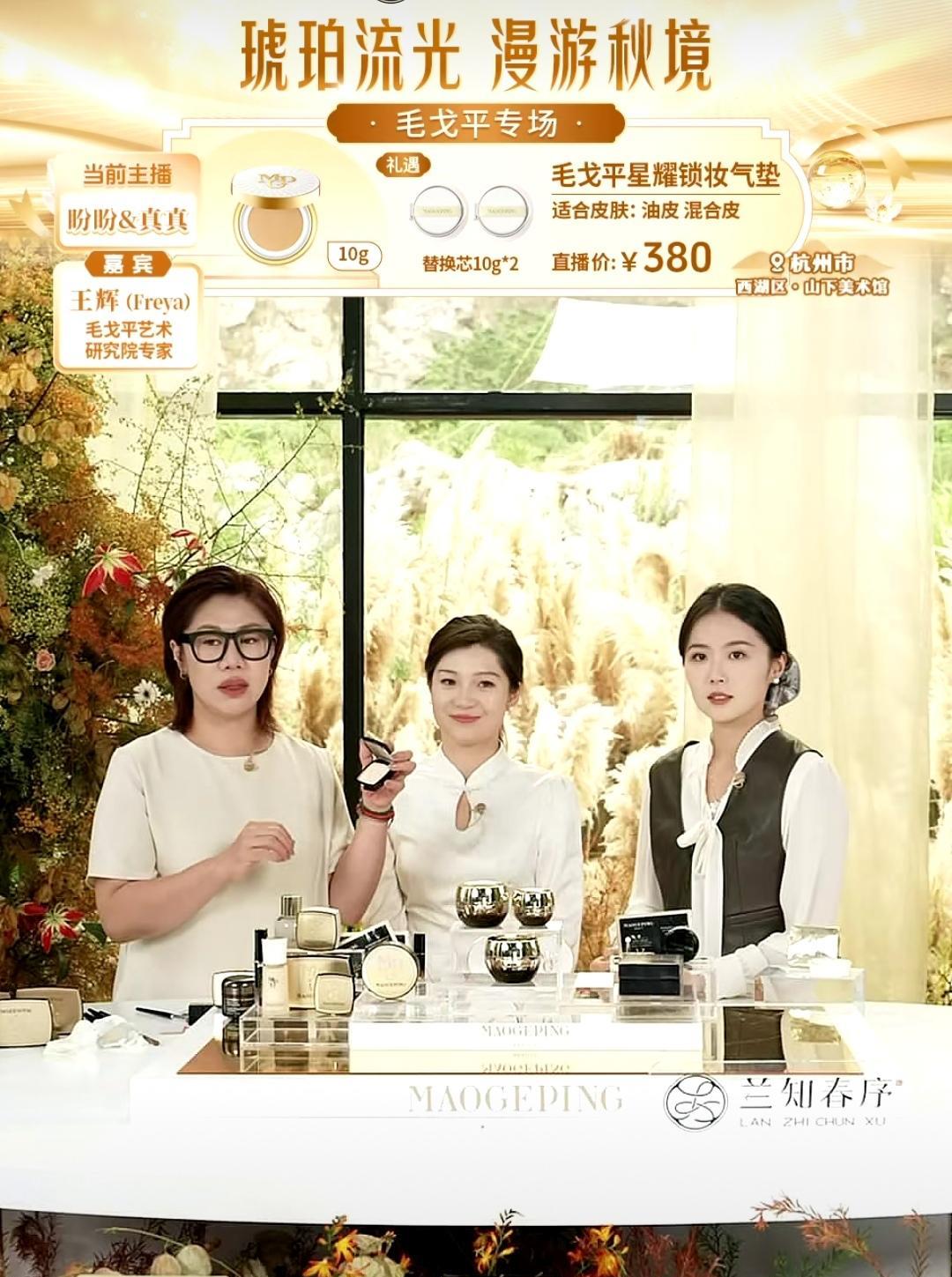 恭喜小兰又创新高,毛戈平专场5小时GMV超1880W。有朋友说,数据不错,但我更关心另一件事。 盼盼和真真今天的人气非常旺,为什么大家进去了好像舍不得出来。 可能很多朋友都发现了,是的,这次的专场非常好,品牌方也用心了。 今天兰知春序大部队这么远奔赴杭州,到总部进行溯源,肯定不只是卖货。 盼盼和真真当模特,请到了品牌的王辉老师现场演示教学,一边介绍产品,一边教大家怎么用。 比如,水油皮、黄皮、黄黑皮怎么处理,水油平衡怎么控,什么时候该补妆,什么产品适合什么肤质等等。 老师讲的非常详细,许多朋友蹲在直播间几小时舍不得出来,专门学习化妆。 可能平时不太注意的一些问题或知识盲区,通过老师的讲解,终于懂了,原来还可以这么用,甚至纠正了一些错误用法。 所以,盼盼和真真她们不只是卖货,她们可能更希望这些知识对你有所帮助。 最后根据抖查查数据,那个气垫销量第一,面膜第二,以后还会有更多的合作返场。