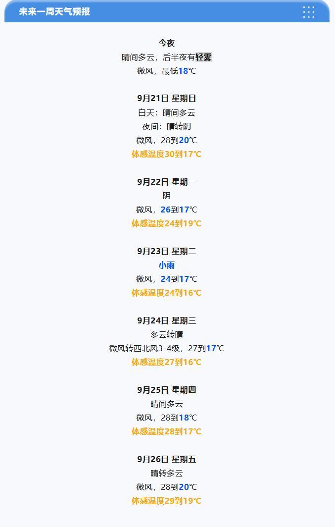 【注意!#天津#气温还要“一降再降”!】22日(下周一),津城天气阴,且气温呈下滑趋势,最高气温26°C;23日(下周二)小雨,气温持续下滑,最高气温24°C;24日(下周三)晴空重现,最高气温回升至27°C,但风力加大,有西北风3-4级;25-26日(下周四-五)晴到多云为主,微风,最高气温28℃;27日将再次迎来阴天过程,气温起起伏伏,请注意根据天气变化适时调整着装,以免着凉感冒。(天津气象)