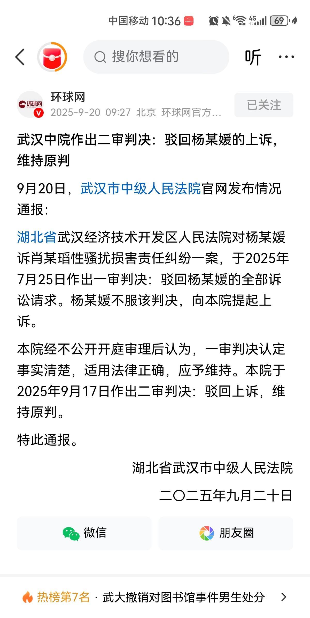 太慢了:武汉大学的决定,偏偏在武汉中院二审判决公布后才做出… 针对图书馆事件,武汉大学未能第一时间作出决定,再三等待上级指示。作为教育部直属高校、全国知名学府,这难道不是在甩锅吗? 武汉中院作出二审判决,驳回杨某某的诉讼请求后,武汉大学迅速撤销对肖某某的处分决定,维持了对杨某某的硕士论文学位授予。 如此一来,肖某某被冤枉,杨某某保住了硕士学位,还处理了一批中层领导和教师,却唯独缺少杨某某的道歉。她至少存在诬告行为,可这违法成本也太低了。 ~end~ #晒图笔记大赛#