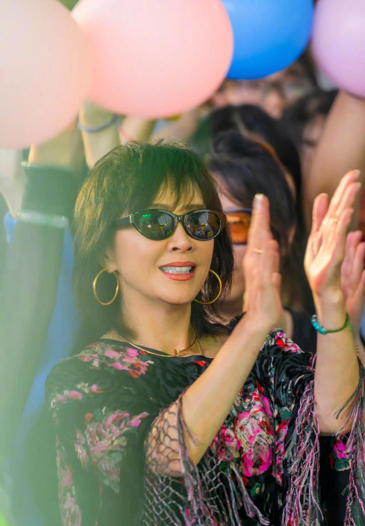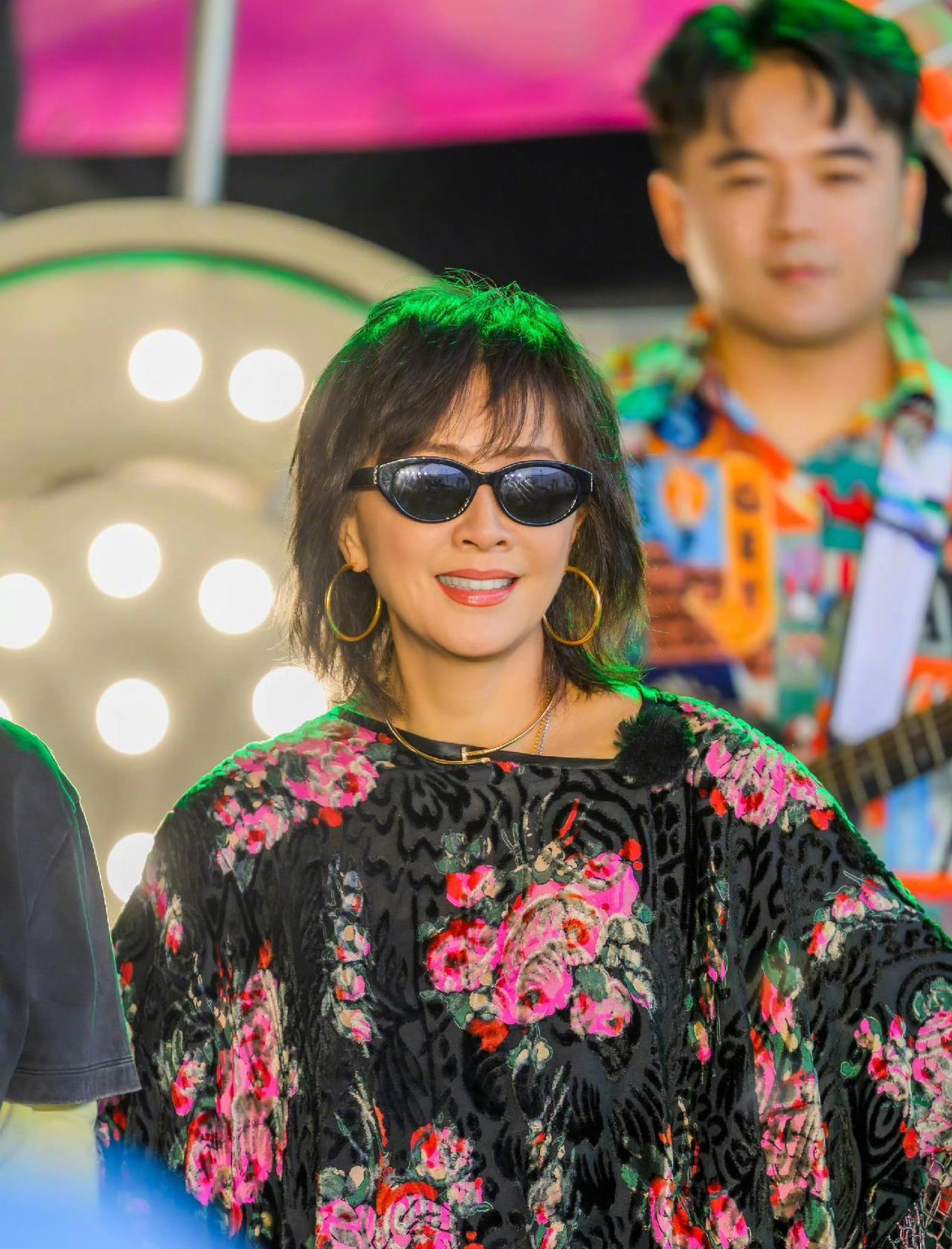 《一路繁花》中的刘嘉玲姐姐,戴着黑色墨镜,身着短牛仔裤衩与花上衣,尽显女王风范,