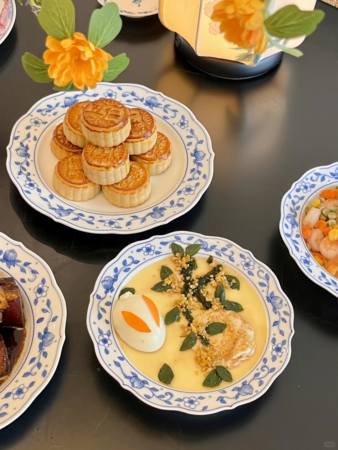 虾仁炒时蔬、花好月圆蒸蛋、每年都少不了月饼🥮
