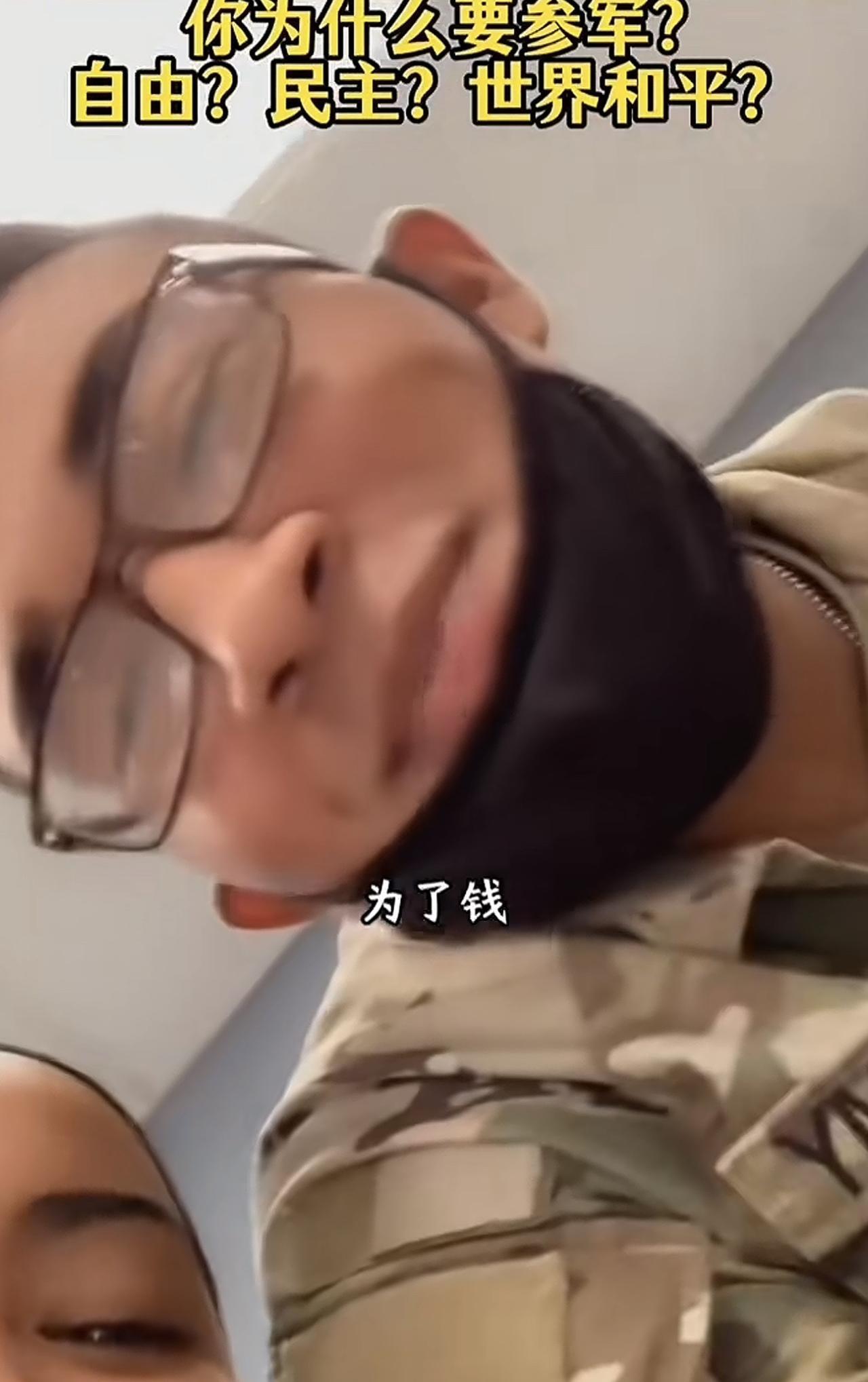 美军不愧是“乌合之众”,问许多人为什么参军?有为了绿卡的,有为了美食的,有为了泡妞的,有为了“屁”的,有为了“不知道”的,不过大部分都是为了“马内”的……反正所有人的回答都是五花八门,什么回答都有。有人说他们就是一群乌合之众,怎可能打胜仗?也有人说他们虽然是军人,但也是来自人民群众的子弟,他们说出的是自己心里实话,也是真话,不装不虚伪,让人听了舒服。