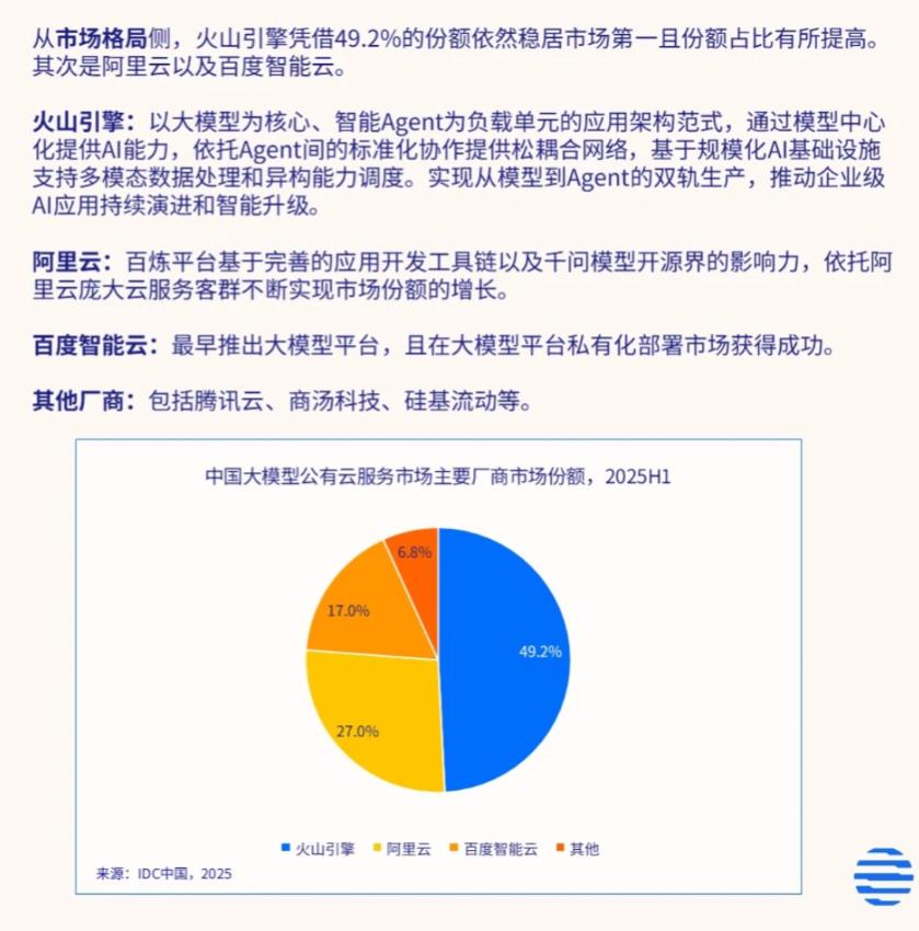 权威机构发布最新数据,中国AI云市场格局有了新变化。2025年上半年,中国大模型公有云调用量达536.7万亿Tokens,火山引擎以49.2%的市场份额位居中国市场第一,紧随其后的是27.0%的阿里云和17.0%的百度智能云。这份报告统计的是各大云厂商对外部客户提供的大模型公有云服务调用量,不包含自有业务调用,也就是说,比如火山引擎的统计就不包括抖音APP、豆包APP等自家业务的调用。