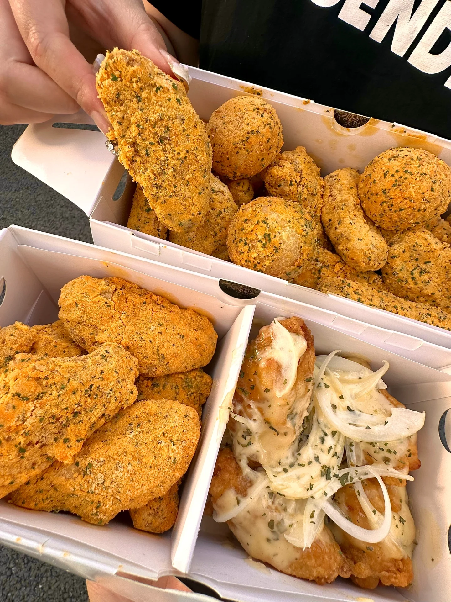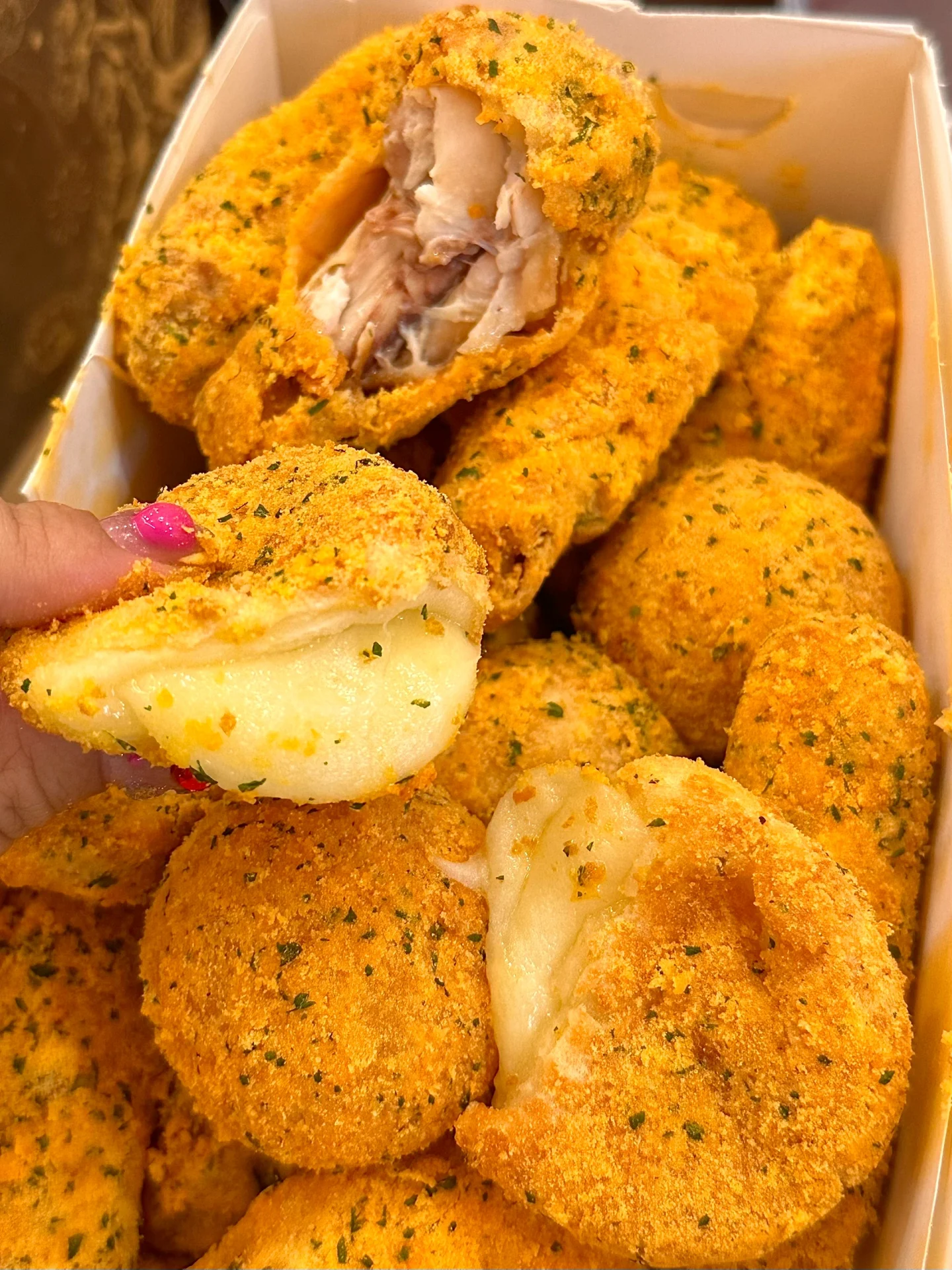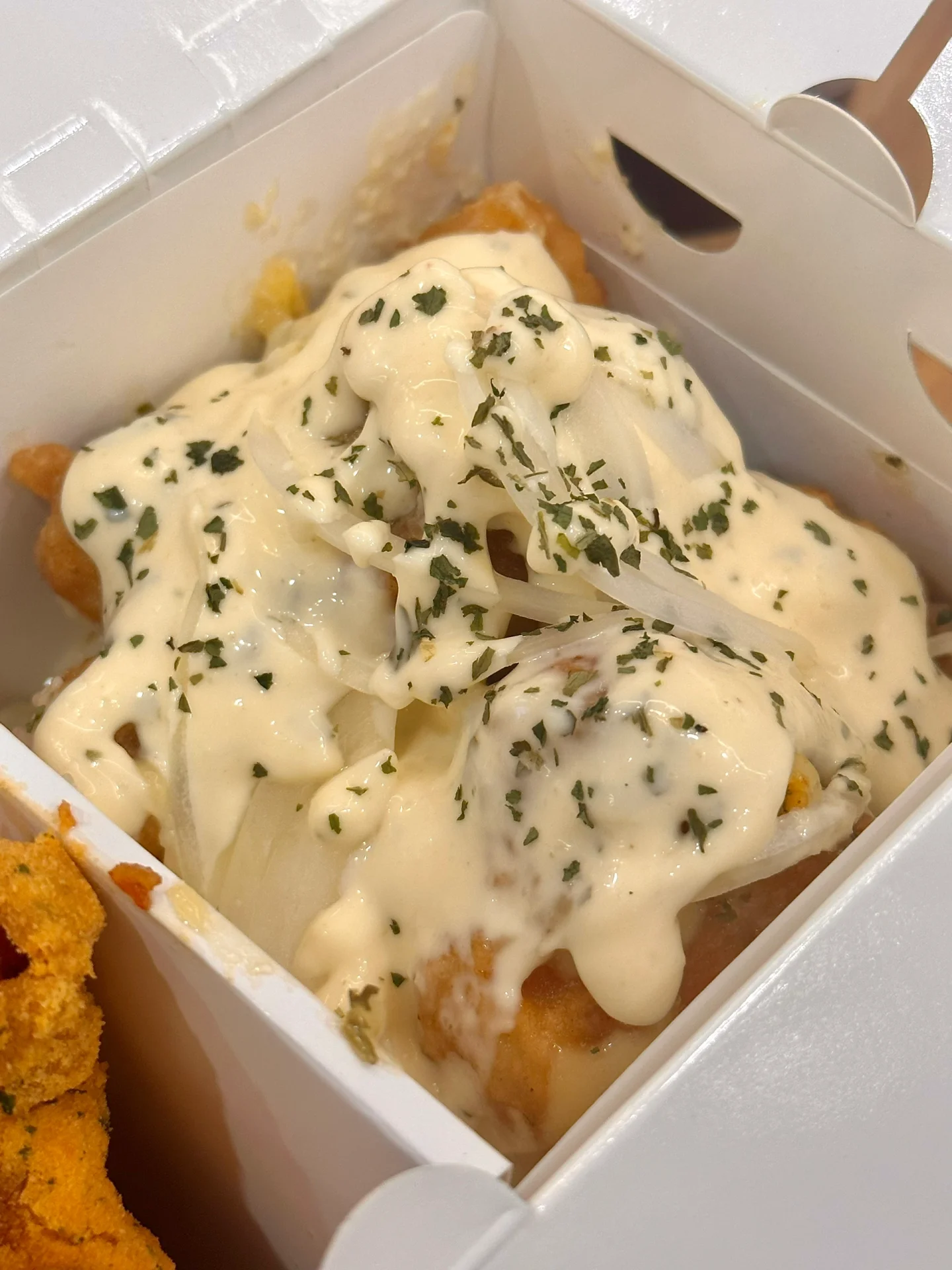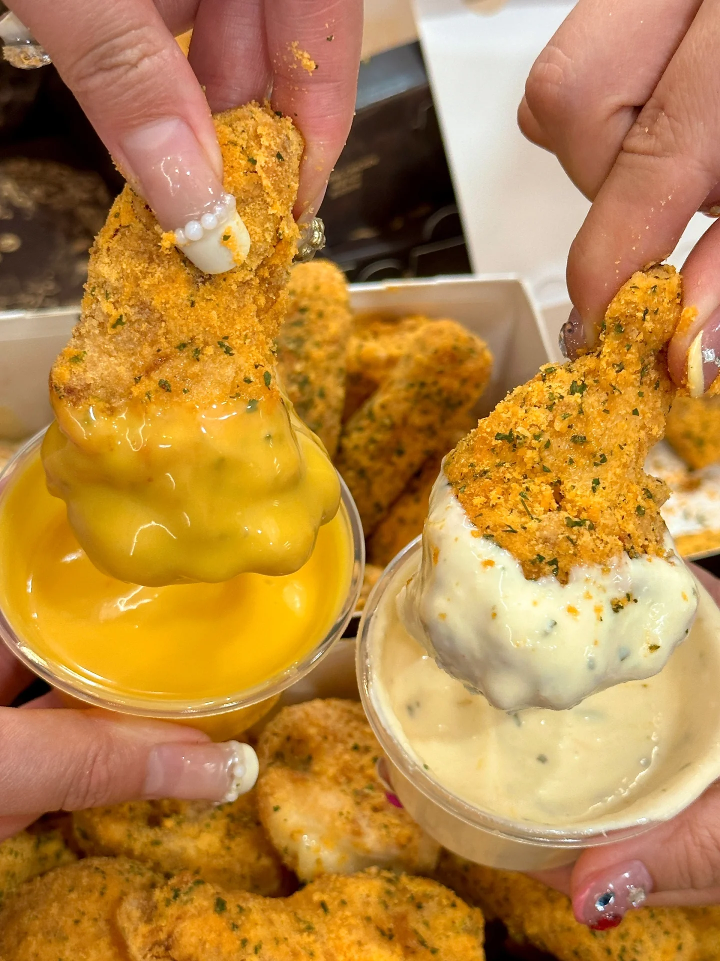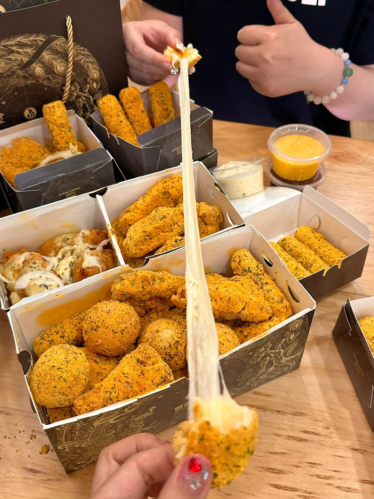 芝士雪花炸鸡,趁热咬下去还会爆汁😭还可以➕份奶霜酱,奶香又咸香真的好好吃啊!!我们还点了芝士球和芝士条,芝士脑袋看到根本走不动路!!