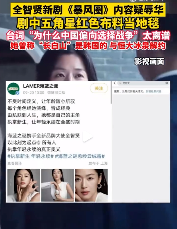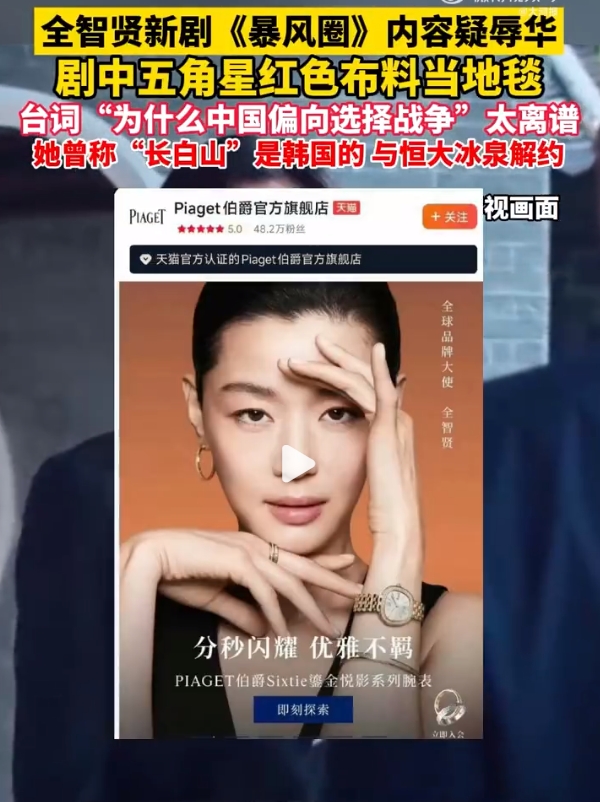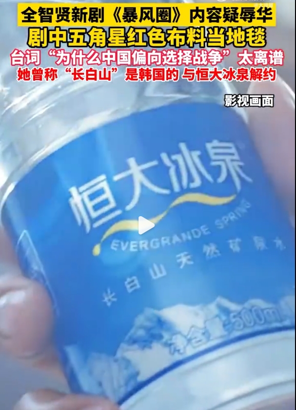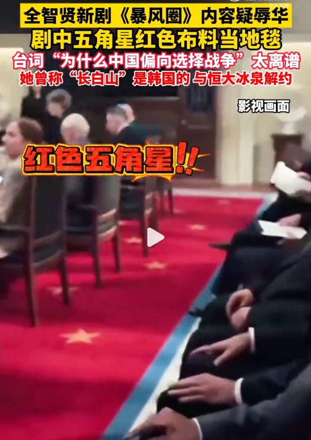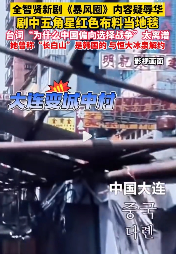 近日,韩国女星全智贤出演的新剧《暴风圈》,剧中出现了很多辱华台词和镜头。
