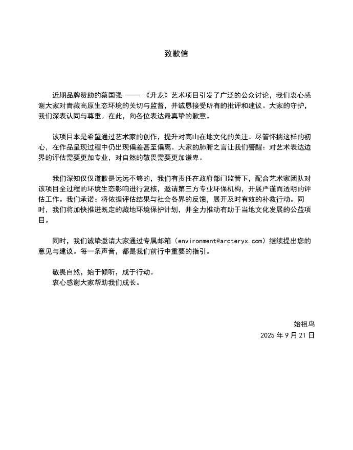#始祖鸟海内外道歉内容不一致#【#始祖鸟海外发英文致歉#:烟花事件与品牌价值观背道而驰】9月20日,户外品牌始祖鸟联手以火药爆破作品成名的艺术家蔡国强,在喜马拉雅山放烟花的事件,引发争议。21日,始祖鸟在海内外分别致歉。其海外平台致歉信表示:始祖鸟对于近期在青藏高原的烟花表演事件,深感遗憾。这一行为与品牌长期以来秉持的环保价值观背道而驰,也与我们希望成为的样子不符。对此,我们郑重致歉。