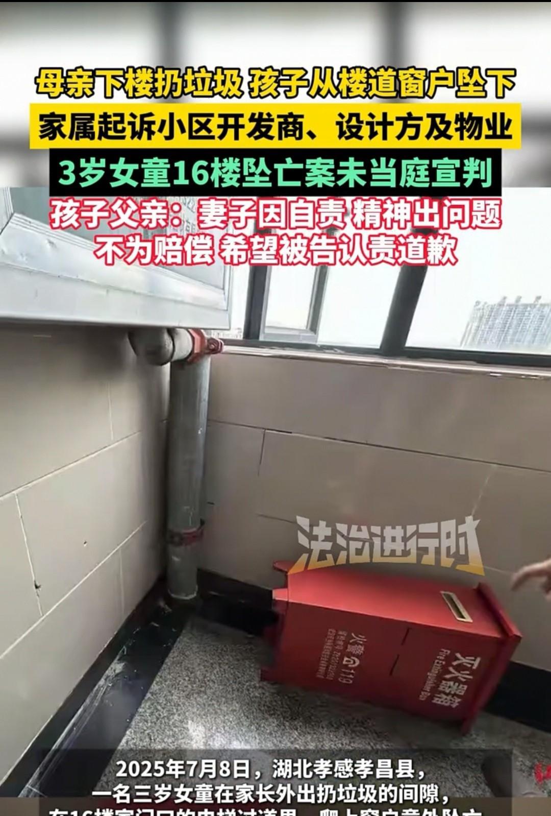 湖北孝昌,黄女士仅下楼扔垃圾短短几分钟,3岁女儿惠惠就独自出门,从16楼楼道不幸坠亡。事发后,惠惠父母起诉开发商、设计方及物业索赔51万余元,而物业仅愿赔偿1万元人道主义补偿。9月19日,孝昌县人民法院开庭审理此案后择期宣判,这场悲剧的责任划分与赔偿金额,成了众人关注的焦点。 2025年7月8日早上8点,湖北孝昌某小区的电梯门打开,黄女士拎着垃圾袋走出来,心里还想着快点回来,惠惠还在家等着。 她出门前跟3岁的女儿说妈妈丢完垃圾就回,却没料到,这短短几分钟会变成一辈子的痛。 刚走到楼下,头顶突然传来砰的一声闷响,紧接着就是邻居的惊呼,说有孩子坠楼了。 黄女士浑身一僵,脑子里第一个念头就是惠惠——她刚离开家,孩子还独自在16楼。 她赶紧扔掉垃圾袋,疯了似的往单元楼跑,慌慌张张按下电梯键,手指因为用力都发白了,眼睛死死盯着电梯数字一点点往下跳。 电梯门一开,黄女士冲进去按了16楼,心脏咚咚跳得快要冲出胸膛。到了16楼,她一眼就看到自家虚掩的门,冲进去喊惠惠,客厅、卧室都找遍了,却没看到孩子的身影。 这时,楼下的哭喊声传了上来,她跌跌撞撞跑到楼道窗户边往下看,楼下的私家车上,那抹粉色正是惠惠早上穿的裙子。 黄女士腿一软,顺着墙滑坐在地,眼泪止不住地流,嘴里反复念叨,说自己不该把孩子一个人留在家。 惠惠的父亲徐先生接到电话时,手还在抖,连手机都差点拿不稳。 赶到小区,看到楼下围满了人,民警正在勘查,他拨开人群冲过去,看到医护人员摇着头站起身,眼睛瞬间就红了。 他声音哽咽,说自己早上出门前还抱过孩子,说着就蹲在地上,双手捂着脸,肩膀不停发抖。 之后的日子里,徐先生一遍遍在16楼楼道里查看。 他看着窗台下方那台约60厘米高的灭火器箱,又想起惠惠92厘米的身高,眼泪忍不住掉下来,说孩子平时够不到窗台,肯定是踩着这个上去的。 可16楼电梯过道没有监控,他没法知道女儿最后是怎么走向窗户的,只能对着墙上隐约的小手印发呆,心里像被揪着一样疼。 黄女士则总坐在客厅沙发上,抱着惠惠没玩完的玩具熊,眼神空洞。 她总想起出门前,惠惠黏着自己要一起下楼的模样,内疚像潮水一样将她淹没,说要是自己当时带孩子一起走,就不会出事了。 徐先生找物业协商,可对方只说没责任,愿意给1万元人道主义补偿。 想到事发当天,有业主在群里提议给楼道窗户装防护栏,物业却直接解散了群,徐先生又气又痛,说这不是不负责任吗。 夫妻俩最终决定起诉开发商、设计方和物业,索赔51万余元。9月19日开庭那天,黄女士坐在旁听席上,听到涉事三方的律师说无过错时,紧紧抓着徐先生的手。 徐先生深吸一口气,低声说,咱们等法院的判决,不能让惠惠白白受委屈。 9月19日下午,该案在孝昌县人民法院开庭,经过3个多小时审理,法院宣布择期宣判。 那么,徐先生他们能够获得多少赔偿呢? 根据《民法典》第三十四条,监护人不履行监护职责或者侵害被监护人合法权益的,应当承担法律责任。 家长把3岁女童独自留在家中,属于监护不到位,大概率需承担50% - 70%的主要责任。 依据《民用建筑设计统一标准》相关规定,若经核查,开发商与设计方的设计不符合规范要求,如楼梯走道窗户外开90度却未设置任何防护措施,存在严重设计缺陷,那么可能需承担10% - 30%的责任。 按照《物业管理条例》第四十六条、第五十五条,物业服务企业应当协助做好物业管理区域内的安全防范工作;物业存在安全隐患,危及公共利益及他人合法权益时,责任人应当及时维修养护。 物业随意摆放灭火器箱造成安全隐患、未及时处理窗户防护缺失和未贴警示标志等问题,过错明显,责任比例可能在10% - 20%。 对于这件事,大家又是如何看待的呢?文中人物均为化名,素材来源于红星新闻9月20日报道。