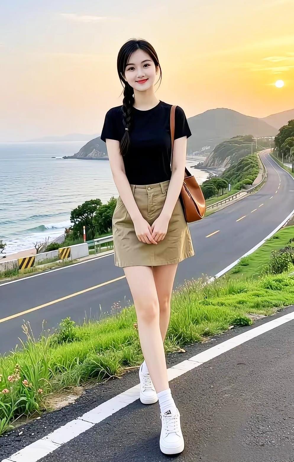 她长得也太甜了吧!黑色T恤配卡其色短裙,简约又透着时尚感。海边公路当背景,衬得她格外清新动人,笑起来像海风一样温柔,妥妥的美少女。