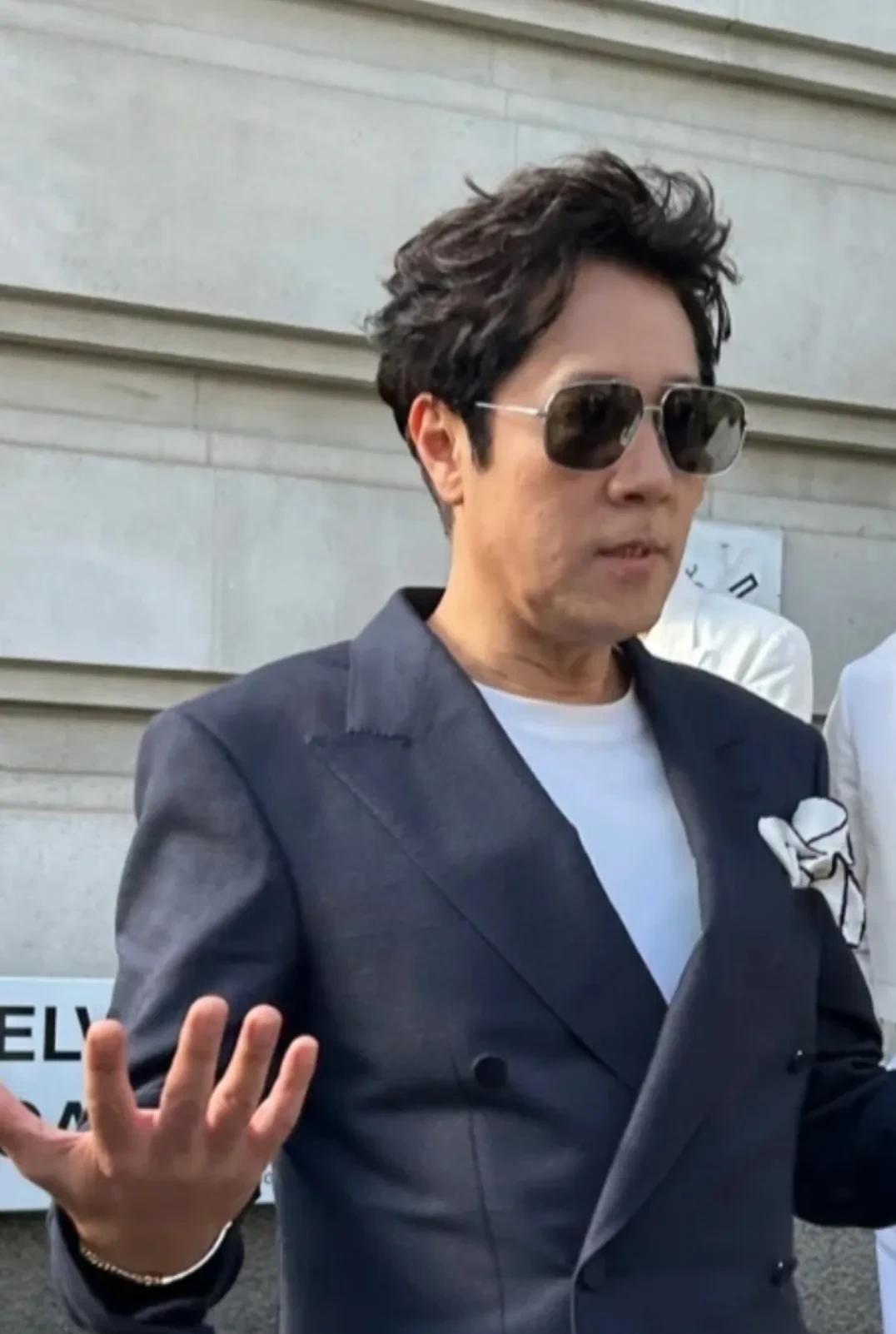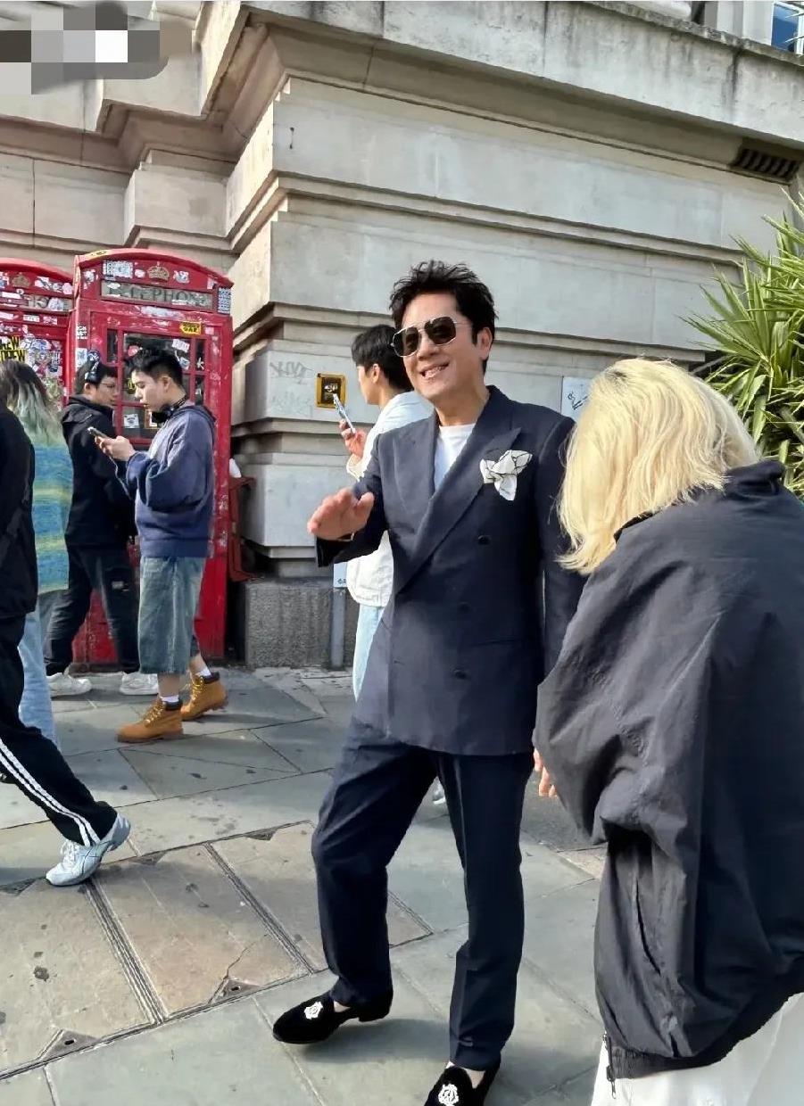 57岁的蔡国庆现身英国参加活动,戴着墨镜,穿着西装,本人很瘦,有点双下巴,嘴唇很