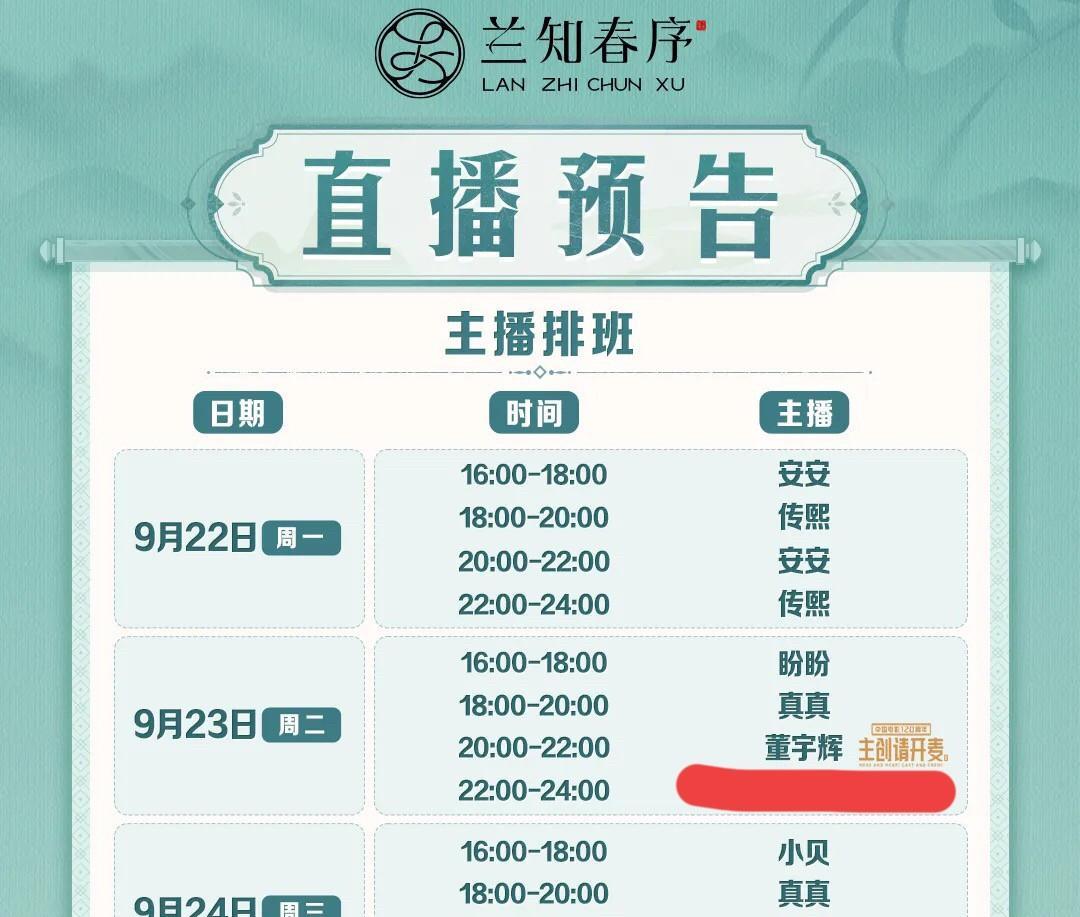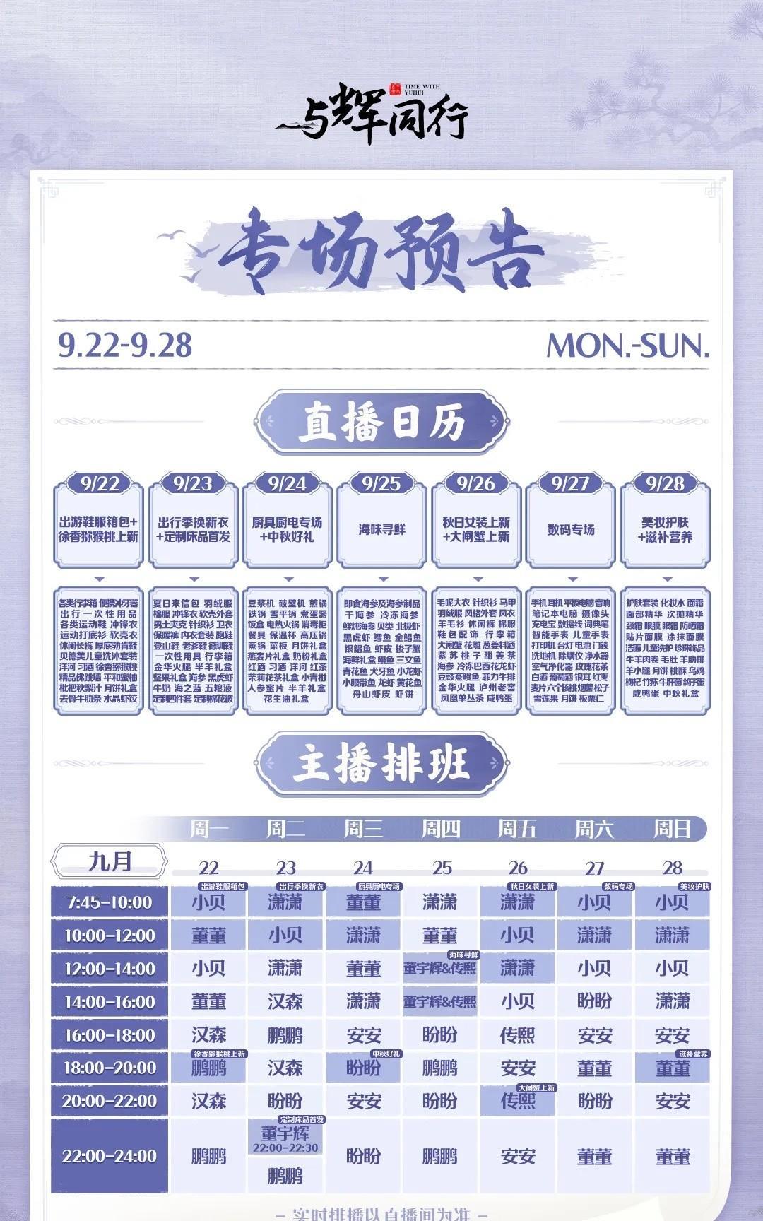 与辉同行本周排班表信息量很大啊 首先是访谈,易中天老师做客兰知春序 整整2个小时的对话,时长感人啊[耶] 这次小伙伴们绝对可以尽兴了[比心] 其次是定制床品首发,有纯棉四件套 由知名品牌富安娜提供定制 以及定制棉被,目前还不知道合作方 当然还有大家心心念念的夏日来信包 都会在周二晚上10点在与辉同行开售 第三是海鲜专场,上周才听宇辉聊起 这周就奔赴现场开始直播了,效率真高 目前还不知道具体地点,都猜是大连 按照以往的经验,就看哪个文旅活跃了[大笑] 相信过不了多久会被万能的网友扒出来的 本周整体来看含辉量还可以 不过这周过完就是国庆双节了 该不会长假过后才能见到宇辉吧 要是这么看,安排的可太少了[笑哭]