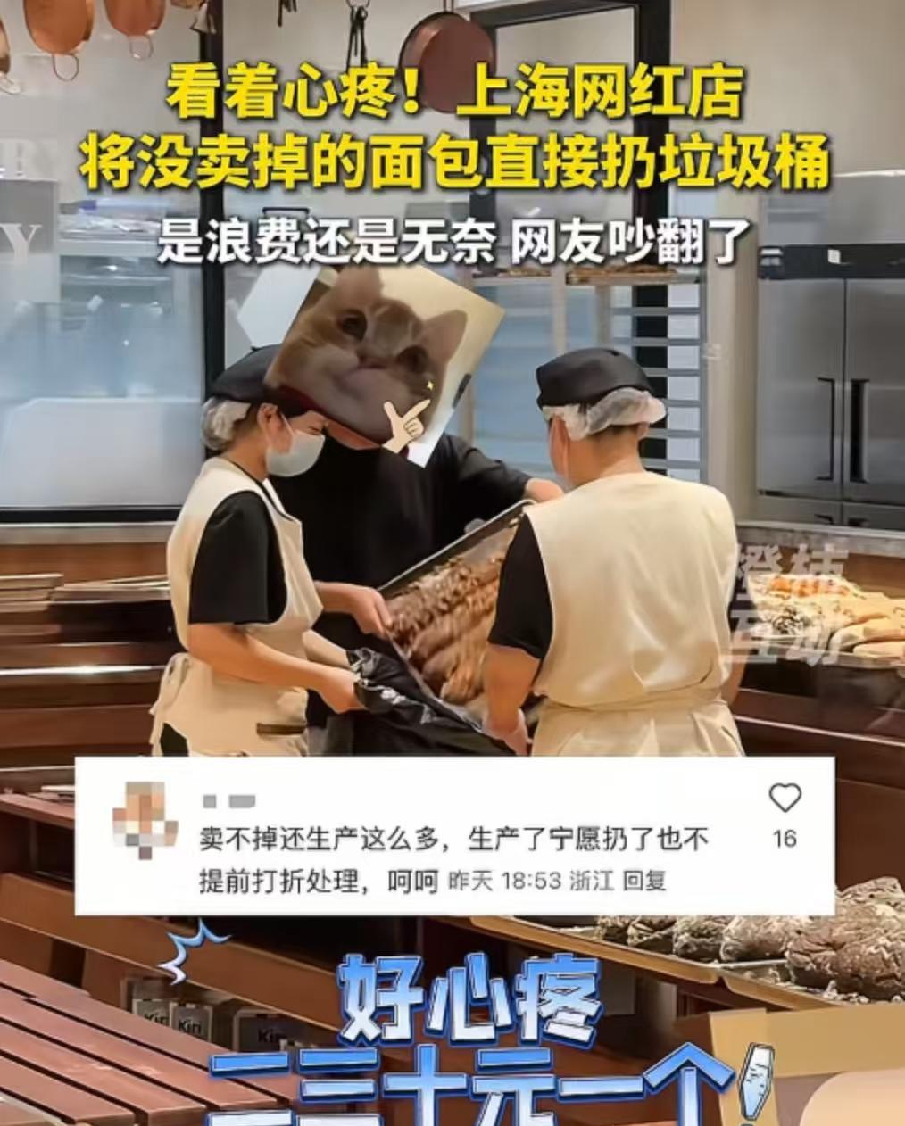 看着心疼!上海一家网红面包店,把卖不掉的面包直接扔进垃圾桶,是浪费还是无奈?网友吵翻了!有网友说:“宁愿扔点也不打折处理,太浪费了!”也有网友说,送给环卫工人、骑手、农民工,为什么要扔掉呢?还有网友说:扔了没毛病!吃坏要赔钱! 当日,女子走进上海万象城的一家网红面包店,眼前的一幕让她瞬间瞪大了眼睛,满是震惊。 只见店员们把一筐筐没卖完的面包统统扔进了垃圾袋。那些面包,每一个都散发着诱人的香气,价格从10块到几十块钱不等,平日里女子自己都舍不得买,此刻却像垃圾一样被随意丢弃。 女子心中满是疑惑与心疼,她鼓起勇气,尝试着向店员询问:“能不能打折卖我一些呀?“ 在她看来,面包放到明天又不会坏,这既能避免浪费,又能让自己品尝到心仪的面包,可谓一举两得。 可是,店员却拒绝了,称公司有严格规定,不能打折售卖,卖不掉的就只能报损扔掉处理。 而门店回应:9月13日当天上海遭遇暴雨天气,导致销售量大幅下滑。而在正常情况下,面包店的报损率在3% - 5%左右。后续公司将加强管理,确保此类事情不再发生。 此事引发了热议,有网友说,可以晚上几点以后半价或者买一送一,这样也能回一些本!或者送给有需要的人也比扔掉好! 也有网友说, 从商人角度看没问题,如果我今天给你打折了,那你们就不会买原价的面包,每天都会等着打折过来吗?那还怎么赚钱!在大众的眼里看就是有问题,你宁愿扔了也不便宜卖给我,太坏了!这就是角度问题! 还有网友说,牛奶卖不掉也都倒掉!如果免费送的话,吃出问题就是面包店的责任,那赔偿金就不是这点面包钱了!这不能怪面包店,只能怪坏人太多了! 从商业角度来看,门店或许有自己的一套运营逻辑,比如维护品牌形象、避免打折影响正常销售价格体系等。 但从社会道德和资源利用的角度而言,这种做法实在令人难以接受。在当今这个倡导节约、反对浪费的时代,大量完好的面包被丢弃,无疑是对社会资源的一种极大浪费。 那些被扔掉的面包,不仅仅是简单的食物,更是背后生产者的心血、运输者的汗水以及大自然赋予的宝贵资源。 商家不能仅仅以商业利益为出发点,而忽视了自身应承担的社会责任。 如果长期这样漠视浪费问题,最终失去的将是消费者的信任和社会的认可,这无疑是舍本逐末之举。 那么,你此事怎么看呢?