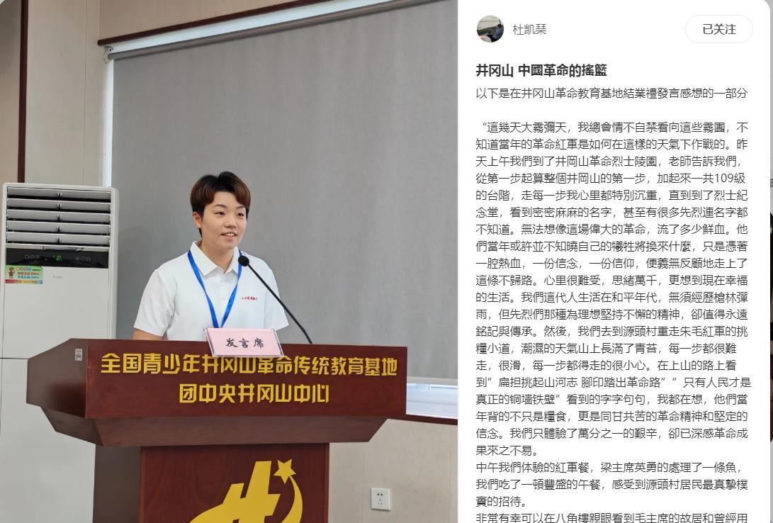 杜凯琹来江西了。 刚刚看到杜凯琹更新了动态,她去了江西井冈山革命教育基地,看到杜