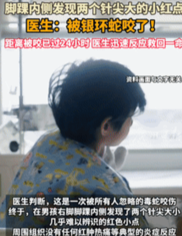 事发当天,母亲带着儿子在郊外采摘,孩子跨越小水沟时不慎摔倒。当时母子俩都未在意这个普通摔跤,第二天男孩却突然陷入昏迷。当地医院检查无果后紧急转院,孩子已生命垂危进入ICU抢救。期间母亲回忆起孩子发病前一晚做过黑白蛇从水中游过的梦,这个细节被新接诊的医生捕捉到——银环蛇正是黑白相间的剧毒蛇种。医生立即重新检查,最终在男孩脚踝内侧发现两个几乎不可见的红点,正是银环蛇特有的微小咬痕。由于已错过24小时最佳治疗期,医生采取每6小时注射大剂量抗蛇毒血清的抢救方案,才将孩子从鬼门关拉回。事后调查发现,事发水沟正是蛇类聚集地,孩子摔跤时很可能惊动了潜伏的银环蛇。