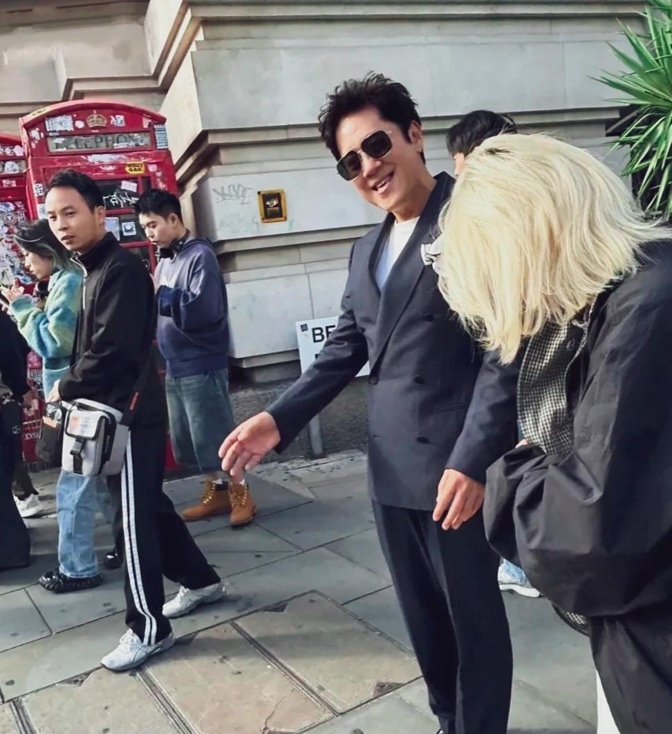 蔡国庆白体恤外面穿西服,穿一双黑色绣着白花的鞋子,这一身打扮不伦不类。看着也不年
