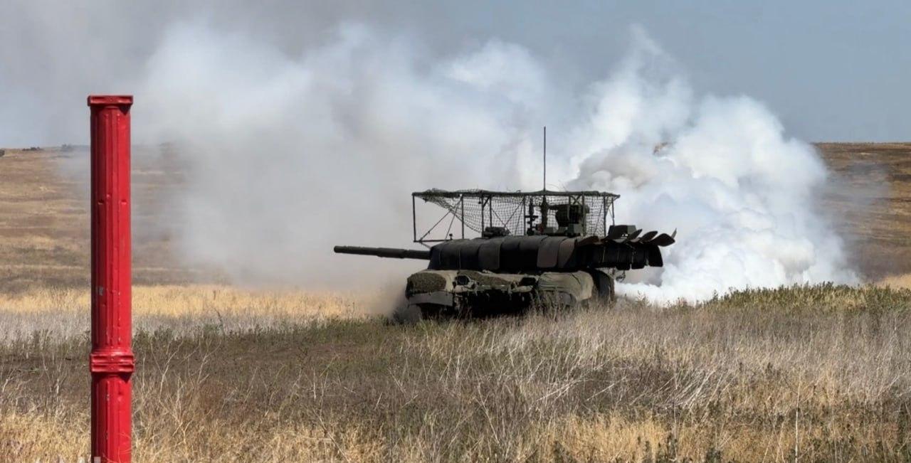 俄军T-90M主战坦克,安装了顶棚和斗篷伪装系统,炮塔安装了大量橡胶板,当装甲防无人机。