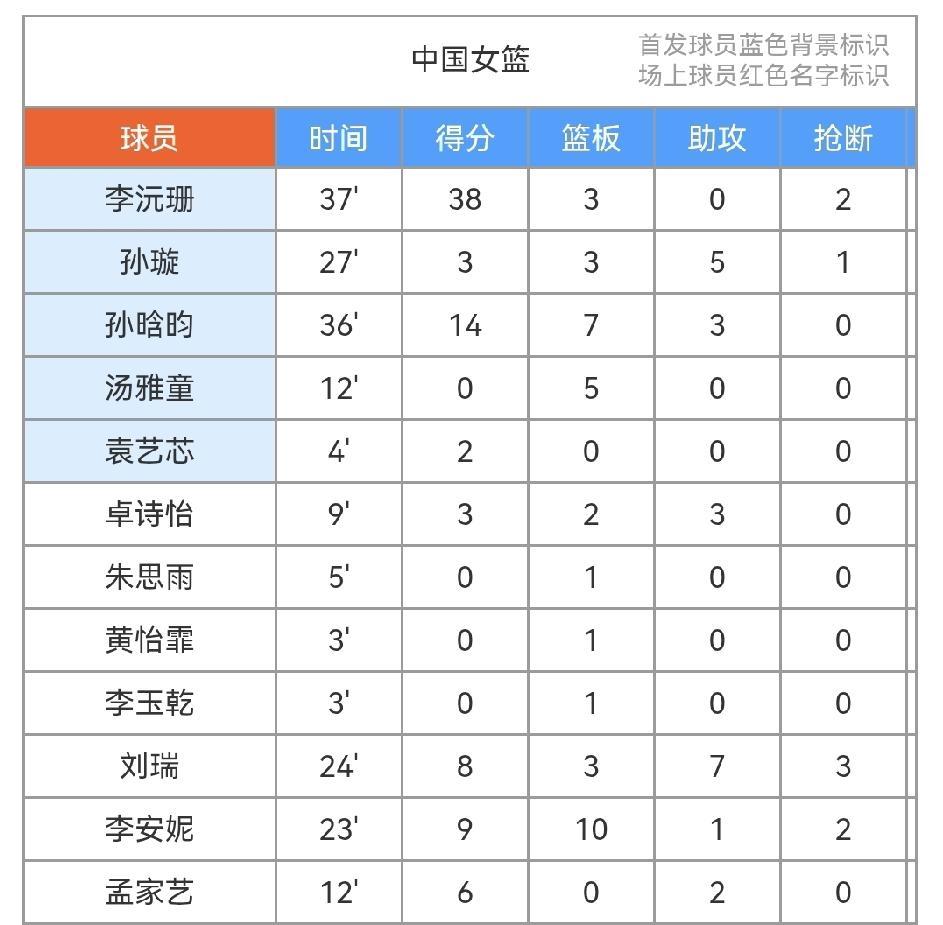 6号孟家艺,身高171公分,6分2助,最大的记忆就是速度真快。 7号黄怡霏,身高174公分,0分1板,多少有些拖后腿,但是并没有大错。 8号袁艺芯,身高174公分,首发登场,但是最后时刻打进了一个超难一条龙上篮,也算及格。 9号卓诗怡,身高173公分,3分2板3助,印象不太深。 11号李沅珊,身高178公分,38分3板2断,开场还在疑问为什么都把球给她打,而且效果不好,但是后来就知道,太准了,是不是中国的田中心。目前看十年前后最强的后卫了,当然如果她打后卫的话,应该让她去国家队试试? 12号刘瑞,身高180公分,8分3板7助3断,填满数据栏,而且是助攻最多。 13号李安妮,身高180公分,9分10板,差一分两双,混血球员,应该是还没到15岁,但是对抗很强,动作也很有男子篮球的感觉,防守篮板进攻都在线。她上线的感觉比李梦要强。 15号朱思雨,身高183公分,0分,印象也不大。 16号孙晗昀,身高189公分,14分7板3助,各种旋转,还有突破和运球,未来搭档张子宇打四,可真的很完美。 17号李玉乾,身高191公分,0分,李月汝的妹妹,但是上场时间有限,也可能是有点伤。还有待观察。 18号汤雅童,身高194公分,5板,和孙打双塔,起到很好的保护作用。 总体上看,可以肯定这是差不多十年来最强的U16了,因为上一届张子宇没打U16。 这波球员起来,十年中国女篮无忧,看看李沅珊和李安妮的成长能不能赶上 28年奥运会。