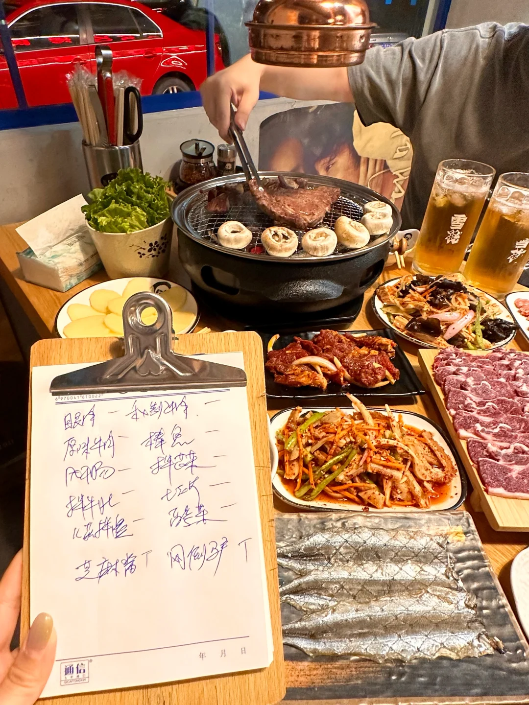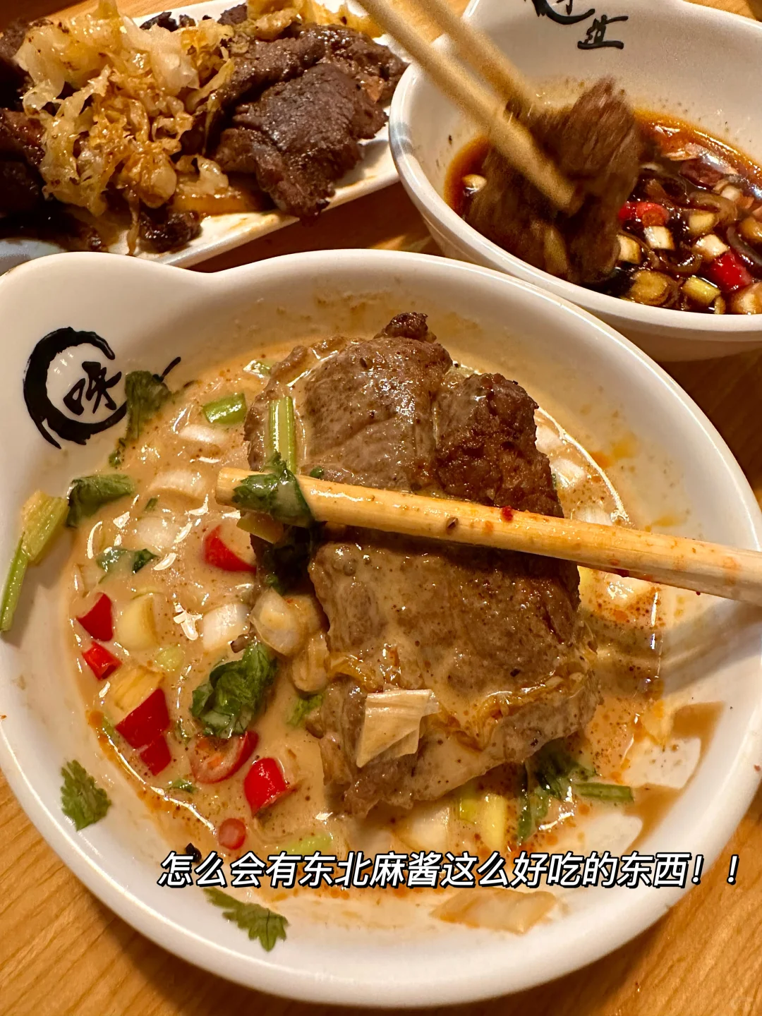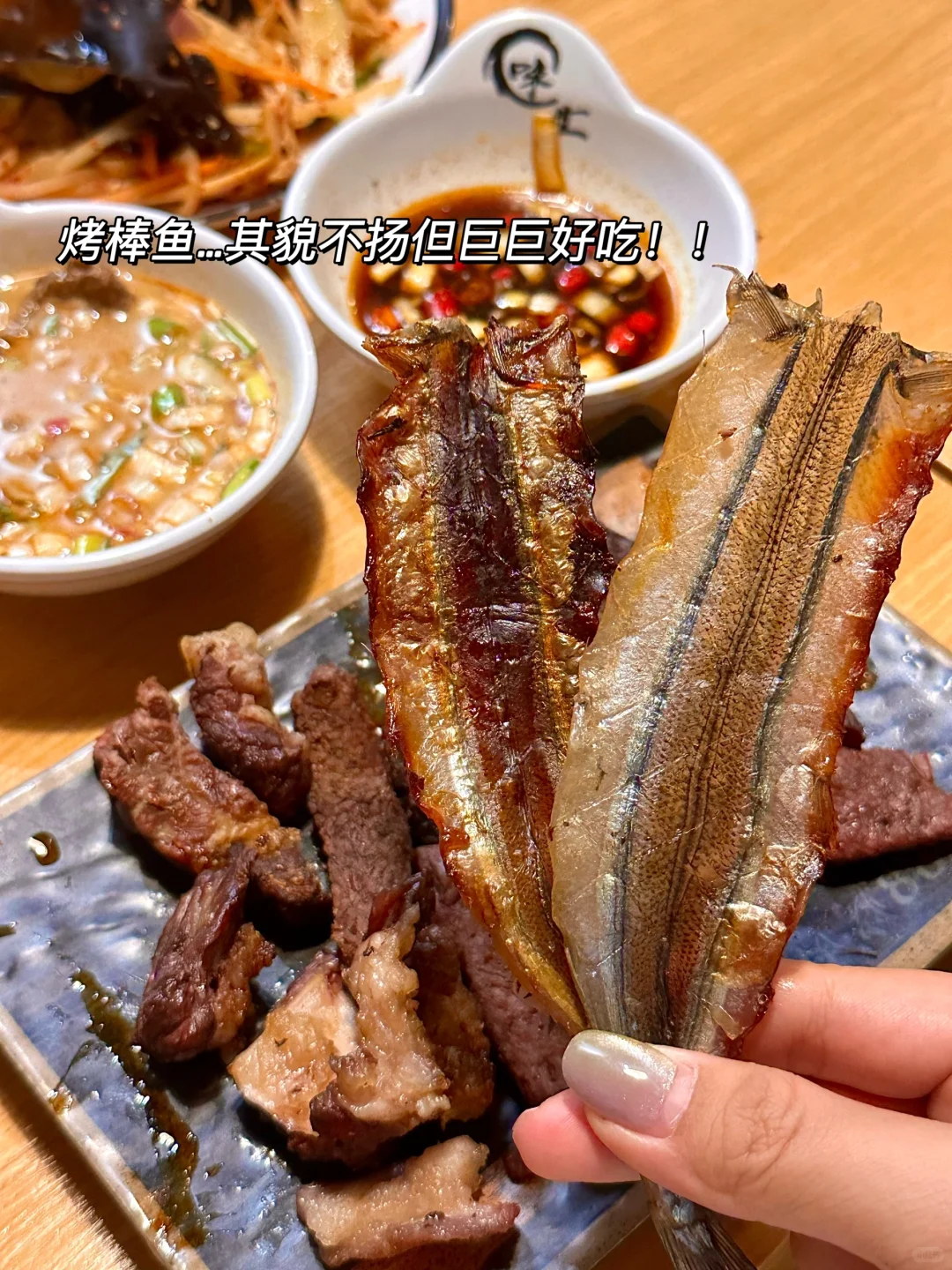 强推这个秘制拌牛肉,一上烤盘香味就直冲鼻腔!吃起来又嫩又香!配上他家干碟好好吃…烤棒鱼!很耐嚼回味还有鲜甜 有种小时候的味道。灵魂是一定要试试他家东北麻酱 黏糊糊好绝 香且不腻…真的蘸什么都好吃!!