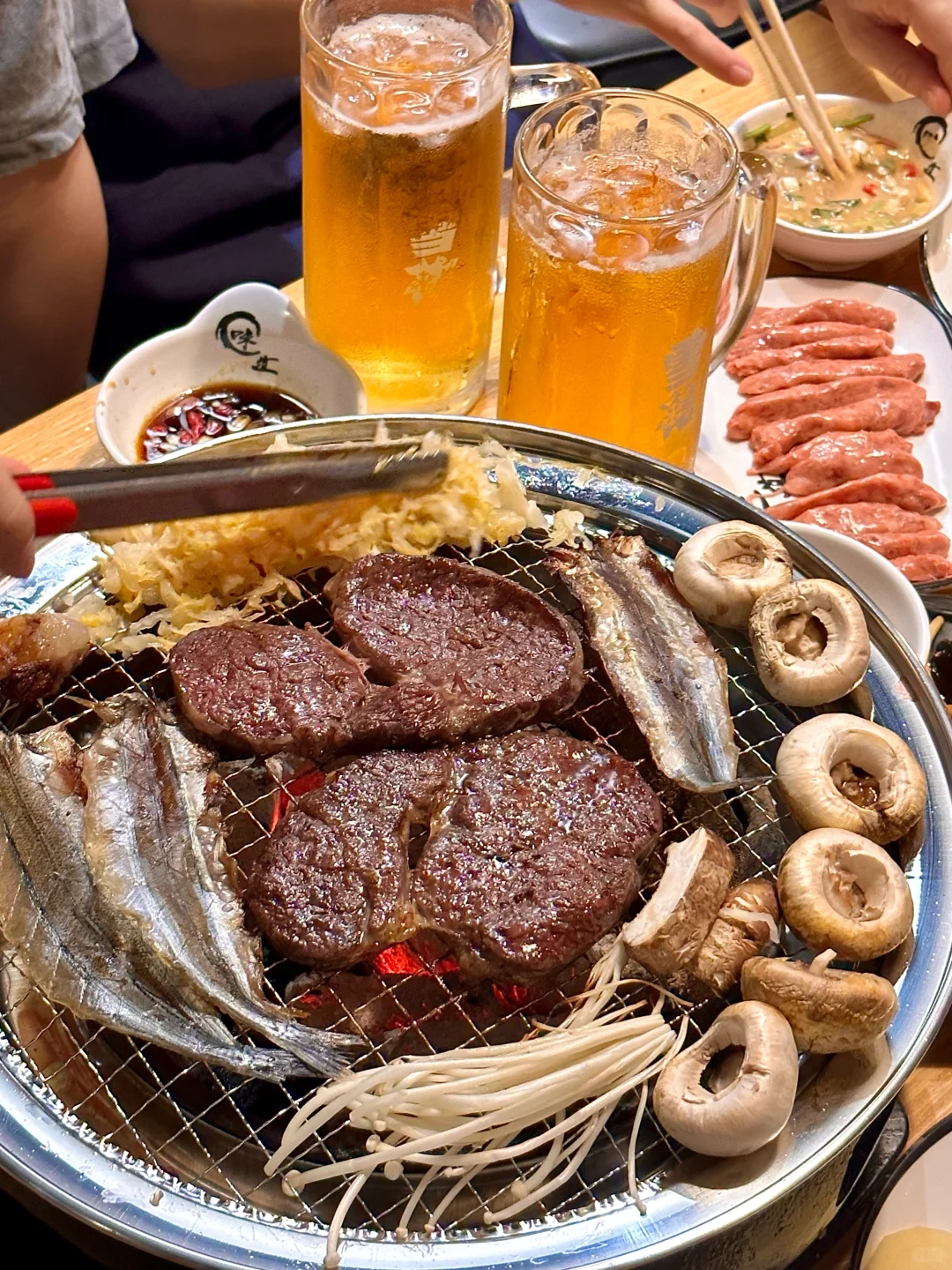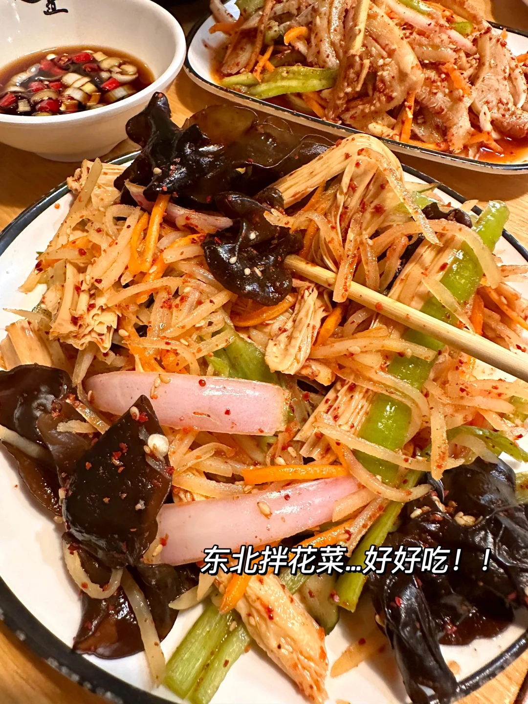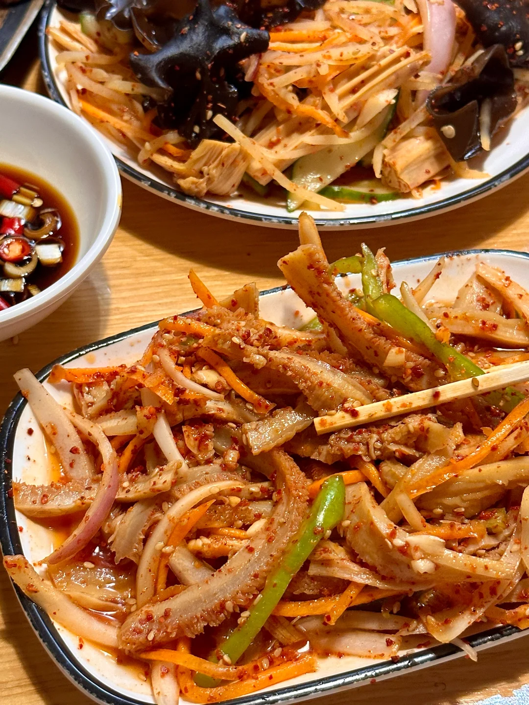强推这个秘制拌牛肉,一上烤盘香味就直冲鼻腔!吃起来又嫩又香!配上他家干碟好好吃…烤棒鱼!很耐嚼回味还有鲜甜 有种小时候的味道。灵魂是一定要试试他家东北麻酱 黏糊糊好绝 香且不腻…真的蘸什么都好吃!!