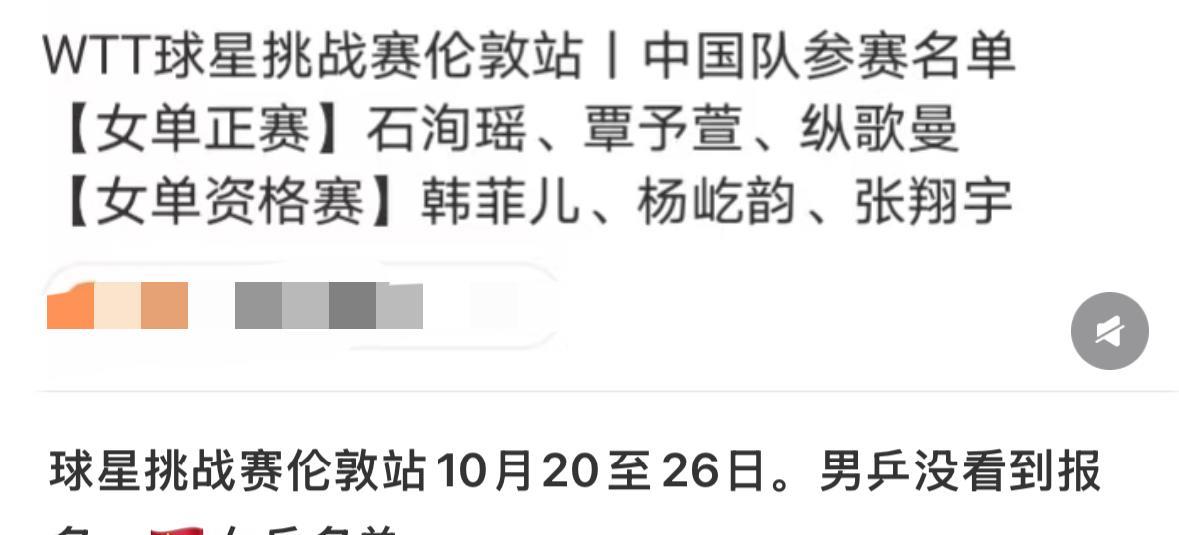 WTT球星挑战赛伦敦站国乒女队参赛名单公布 女单正赛:石洵瑶 覃予宣 纵歌曼 女单资格赛: 韩菲儿 杨屹韵 张翔宇 WTT球星挑战赛伦敦站 将于10月20日——26日 国乒男队还没有报名, 应该还没有打进去吧! 日乒除了大藤沙月,张本美和, 早田希娜,伊藤美成, 桥本,木原,平野都参加了! 日乒是全主力阵容参赛! 国乒加油, 男队加油!
