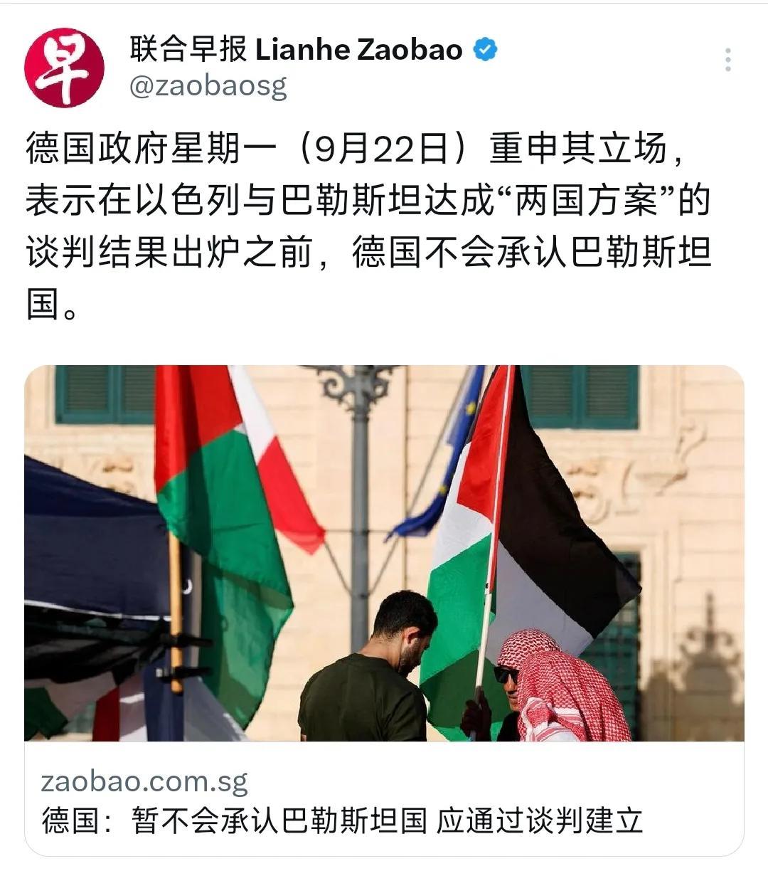 联合早报昨晚(9月22日)报道:“德国政府星期一(9月22日)重申其立场,表示在以色列与巴勒斯坦达成‘两国方案’的谈判结果出炉之前,德国不会承认巴勒斯坦国。” 德国政府把“无条件支持以色列”写进执政纲领,德国纳粹在历史上大肆屠杀犹太人,犯下滔天罪行,德国前总理勃兰特“惊世一跪〞对历史罪行真诚忏悔;巴以冲突以来,德国是军援以色列仅次于美国的国家,支持以色列在加沙地带对巴勒斯坦人犯下种族灭绝罪行,德国领导人还需要跪几次?