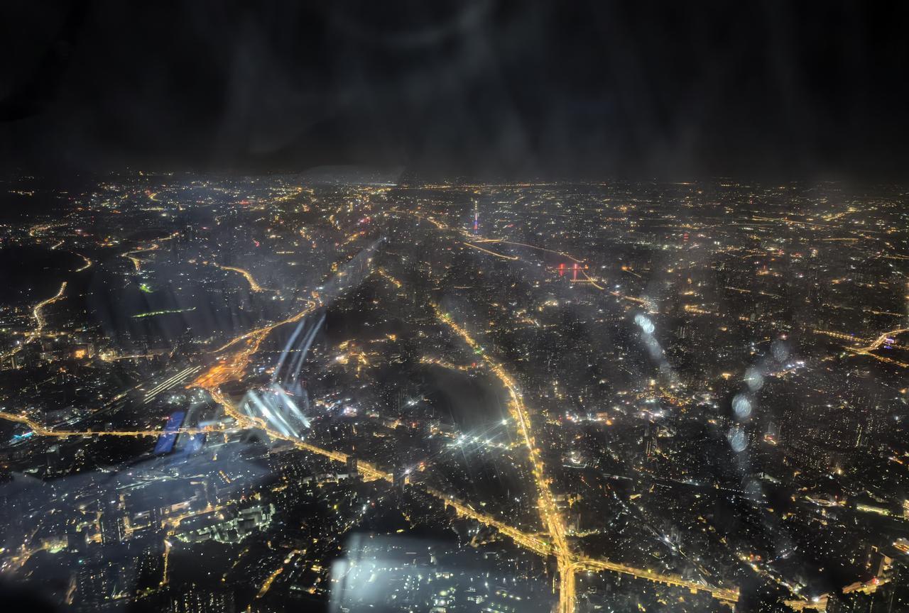 不是说有台风吗?飞机降落看万家灯火,远处的小蛮腰也亮着灯。