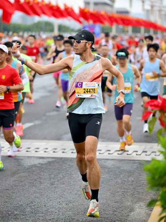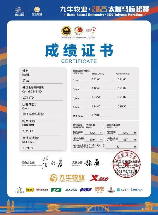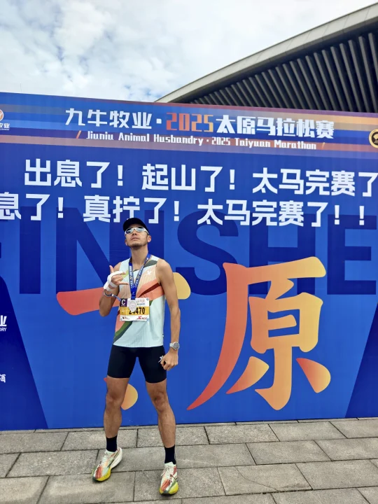 去年回老家太原马拉松跑步没跑好哭了 一下子让好多人认识了我,和我妈哈哈 今年重新回到家乡,中签半马目标PB不能再哭了 但事与愿违8月初我掌骨螺旋式骨折必须戴上护具养着,伤归伤练归练,一点不能耽误咱下半年的目标 赛前想着今天要以1小时28分XX秒实现太马PB 结果赛前一天的适应性早餐跑跑多了哈哈哈 刚开跑为了可以更多咱们热情的老家人互动跑在右侧 所以在C区里和全马选手一起速度起不来,5km平均配速417,我有点慌了因为按照这个情况别说pb能不能跑进130都不好说,所幸过了汾河迎泽大桥又过了全马半马折返点才慢慢可以跑开了,此时10km平均配速415,还是不够,这意味着最后的11km我必须以410的速度来跑,还不能一下子加太猛这样很容易在最后5–3km崩掉!为了太马为了不能再哭,闹它! 不幸的是没想到后半程的滨河西路要穿过好几个桥洞,还是有不少小起伏(话说我半马跑完手表显示累计爬升116米,大家的呢)眼看着手表的平均配速从415到414到413,最后一公里拼了跑到400 冲线后看了下手表的运动时间是12912,应该是pb了但肯定没有跑到128左右,成绩短信通知也迟迟没到,搞得我好紧脏哈哈,后来发现pb15秒也算是一个大石头落地,管他呢在老家pb了就行,一秒都行 哈哈哈所以没有重现去年跑完抱着老妈委屈着哭的画面,迎来的是兴奋的拥抱🫂不过在路上看到好多腿脚不便的老爷爷老奶奶给我们加油,想到如果我的爷爷奶奶姥姥姥爷还在世也一定回来给我鼓劲,我的鼻头就一酸,但也由此可见我们太原马拉松赛道氛围还是挺棒的,【山西菜不入流】但山西人绝对棒! 好啦,以上就是本次太马的赛记复盘,毕竟是秋天的第一场比赛也是伤后的第一场比赛,找到节奏适应身体才是最重要的,跑出负配速收获pb也给未来继续pb留下空间也不赖!还在路上面基了很多网上认识的跑友,开心得不行行! 希望这种借着马拉松回趟家看看爸妈吃吃美食可以成为每年的固定节目哈哈❤️