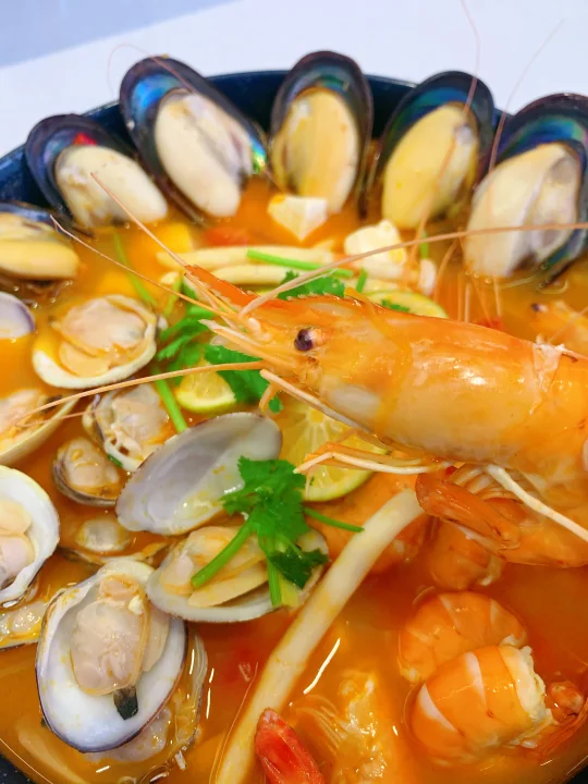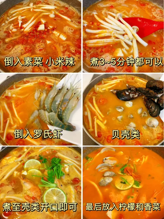 3.倒入素菜,小米辣,煮几分钟,3~5分钟都可以,倒入罗氏虾和壳类,壳类煮至开口即可,最后放入柠檬(煮久了会苦)放入香菜⚠️有薄荷叶的也可以加一点,感觉会更好喝