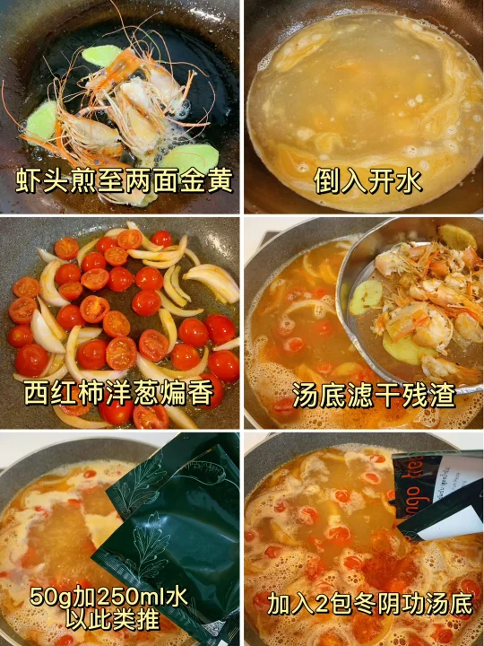 2.番茄洋葱煸炒一下,倒入滤干渣渣的汤,加入冬阴功料包,50g一包加入250毫升的水(如果不小心加多了,可以加一点盐调味,⚠️这款料包添加44%椰浆,可不用另外加,较省事~最好按照比例来,这样更浓郁)