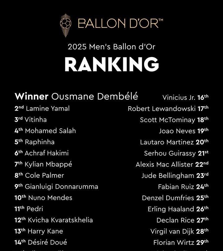2025年金球奖30人排名:登贝莱荣膺金球奖! 其中亚马尔第2,维蒂尼亚第3,萨拉赫第4,拉菲尼亚第5,阿什拉夫第6,姆巴佩第7,帕尔默第8,多纳鲁马第9,努诺-门德斯第10,前十巴黎占据5席! 佩德里第11……