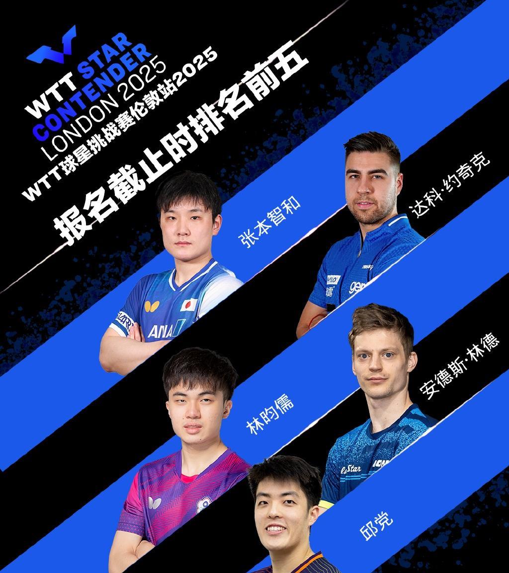 WTT球星挑战赛伦敦站2025将于10月21日至10月26日在英国伦敦铜箱体育馆举办,冠军将获得600点世界排名积分。报名截止时排名前5名单如下: 男子单打: 张本智和 达科 林昀儒 林德 邱党 女子单打: 张本美和 伊藤美诚 桥本帆乃香 石洵瑶 早田希娜