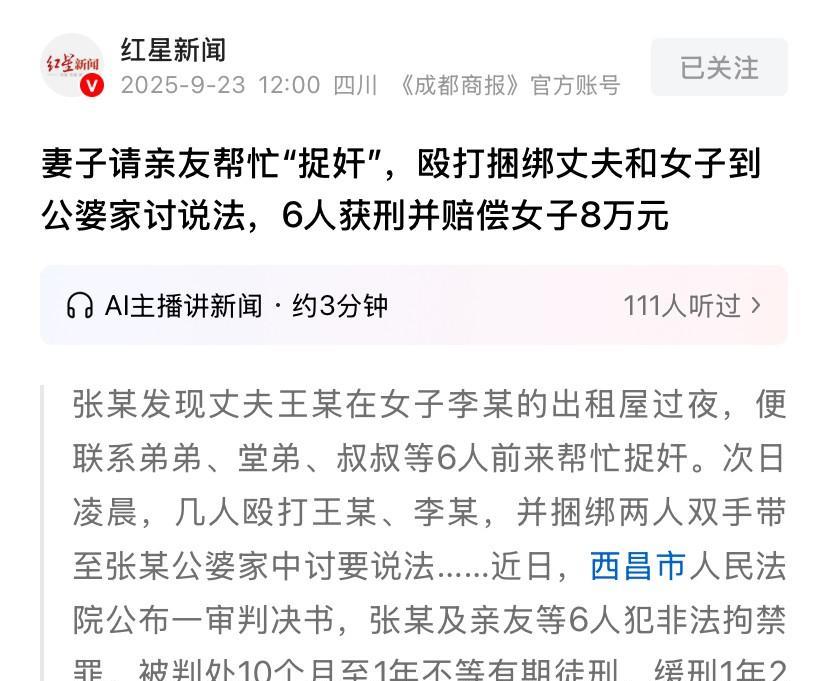 四川西昌,妻子发现丈夫在一女子的家中过夜,怀疑丈夫出轨,遂联系弟弟、堂弟、叔叔等6人前来帮忙捉奸,期间不仅殴打了丈夫和女子,还将二人绑了起来,带到公婆家中讨说法。结果,丈夫的家人看不下去了,直接报警。妻子及其亲友6人悲剧了,最终不仅赔偿女子8万元,还纷纷获刑。(来源:红星新闻、裁判文书网) 据悉,2024年6月9日晚上,女子张某发现丈夫王某夜不归宿,去了女子李某的家中。 怀疑王某与李某发生不正当关系,张某怒不可遏,于是先后联系弟弟、堂弟、叔叔等6人赶来帮自己捉奸。 等待众人期间,张某还准备了4根木棒及2条运输带制作的马鞭。 大约凌晨2点许,张某的弟弟、堂弟、叔叔等其他6人均陆续赶到现场。 众人商量后,决定等王某与李某开门出来后,将两人一同带至王某家中向王某的父母讨说法,同时让黄某某负责拍照。 早上6点多,等王某从李某家出门后,张某等人便一窝蜂冲上前,质问王某并试图进入李某的家中。 因王某立即拉门想将房门锁上,张某便拿木棍击打了王某的头部和手臂。 张某弟弟等人也冲上前,用木棍、马鞭对王某进行殴打,并同王某一同涌进李某家中,质问王某与李某是否发生关系。 虽然王某予以否认,并极力辩解,称自己只是心情不好,来李某家中,期间因喝多了,在李某家沙发上睡着了。李某也这么说。 但是,张某等人根本不信,又殴打了李某,之后用鞋带将王某、李某二人的手绑在背后,并按照原计划将两人带至王某家中,向王某的父母讨说法。 王某的父母见状,赶紧让人报警。案发。 王某与李某之间是否存在不正当关系? 调查期间,王某与李某仍坚称王某只是在李某家中喝多了,在沙发上睡着了。 如何评价张某等人的行为? 且不说,没有证据证明王某与李某之间存在不正当关系,就算是存在不正当关系。张某也应当依法维权。 张某因怀疑王某与李某发生不正当关系,殴打王某、李某二人,并将王某、李某二人绑到王某家中,向王某父母讨说法的行为,已然涉嫌非法拘禁罪。 张某弟弟等人明知道张某的犯罪意图,并向张某提供帮助,与张某属于共同犯罪。 因而除了只是进行了拍照的黄某某外,案发后张某等剩余6人均被警方以涉嫌非法拘禁罪立案调查。 案件处理过程中,张某等6人认识到自身的错误,选择坦白、认罪认罚,并赔偿了李某8万元,取得了王某与李某的谅解。 又因在本次共同犯罪过程中,张某系组织、邀约者,起主要作用,系主犯,张某弟弟等5人起次要、辅助作用,系从犯。 根据《刑法》27条的规定,在共同犯罪中起次要或者辅助作用的,是从犯。对于从犯,应当从轻、减轻处罚或者免除处罚。 最终,除了黄某某被另案处理外,张某等6人均被法院判处犯非法拘禁罪。其中,张某的刑期为有期徒刑1年,缓刑1年6个月,其他人为有期徒刑10个月,缓刑1年2个月。 最后,张某因为怀疑丈夫出轨,结果不仅害了自己,还把自己一家人全给连累了!着实令人唏嘘! 其案件也再次提醒广大朋友们,在感情、婚姻中,遇到问题,一定要冷静、理性、依法处理,牢记冲动是魔鬼! 这事您怎么看?欢迎在评论区留言,与大家一起交流您的看法! ------ 关注@安律说法 案例中看人生百态,法律中寻破局之法!