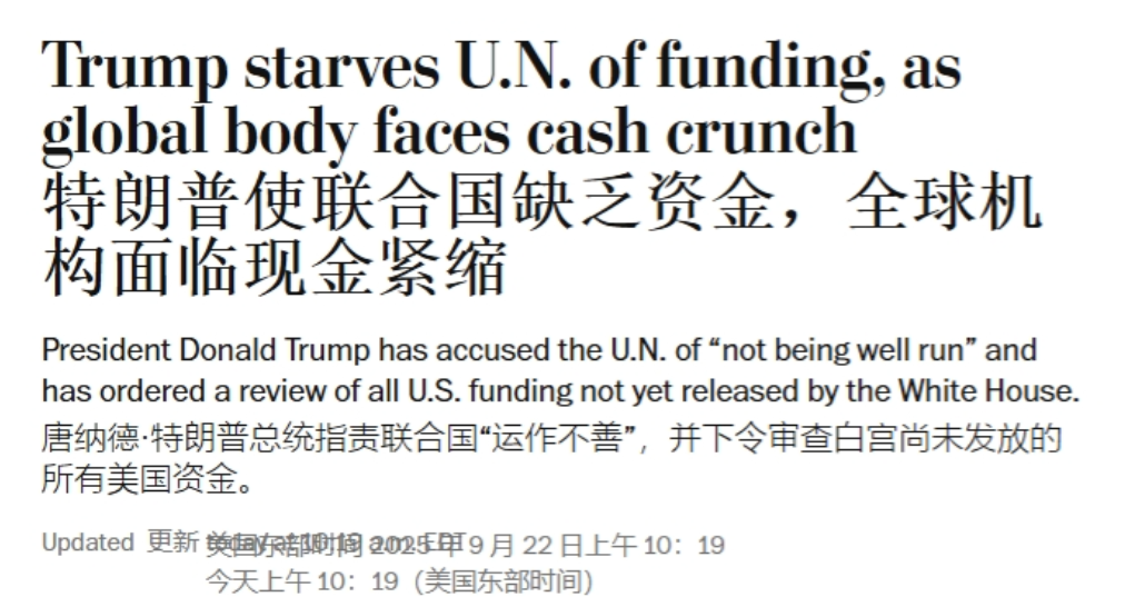 报道称,自今年1月特朗普上任以来,美国再次停止向联合国缴纳会费——然而,这还不算最离谱的,因为根据联合国的数据,美国至今连2024年的欠款都没结清,是联合国最大的欠债国。 但非常讽刺的是,特朗普这边以“美国优先”为由拒绝向联合国缴纳会费,并指责联合国“运作不善”,但另一边又赖在安理会常任理事国的席位上,多次在巴以问题上与其他国家逆行。 就这,美国驻联合国大使迈克尔·沃尔兹居然还声称要“让联合国再次伟大”,属实是非常滑稽了。 最后,彭博社给特朗普提了个醒,根据《联合国宪章》规定,拖欠会费超过前两年应缴金额的国家,将失去联合国大会的投票权——因此,如果特朗普政府2025年最后一轮削减支出法案获得国会批准,美国将首次拒绝缴纳联合国会费。