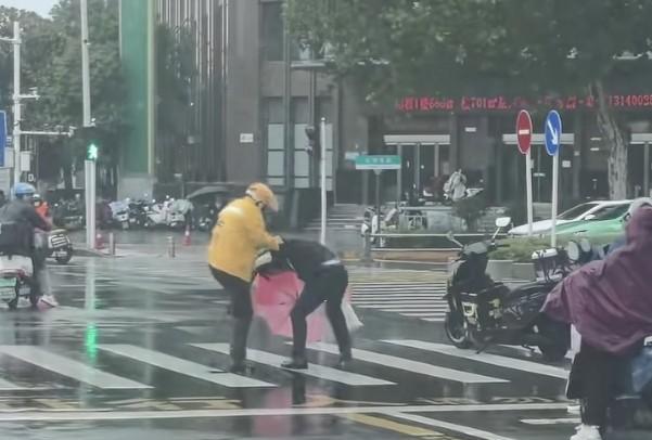雨中一男子和外卖员在路口发生口角,打伞男子用脚踹了外卖小哥的电动车,于是外卖小哥一气之下和这个男人打了起来。男子这行为就很没品。外卖员风里来雨里去,挣点钱不容易,可能就是一点小摩擦,至于这么冲动吗? 大家生活都不容易,多些理解和包容不行吗?外卖员每天赶时间送餐,难免有小意外。遇到问题好好沟通,动手解决不了任何问题,最后搞到大家都不愉快。不过看视频里的东西,这名打伞的男子挨揍不轻。
