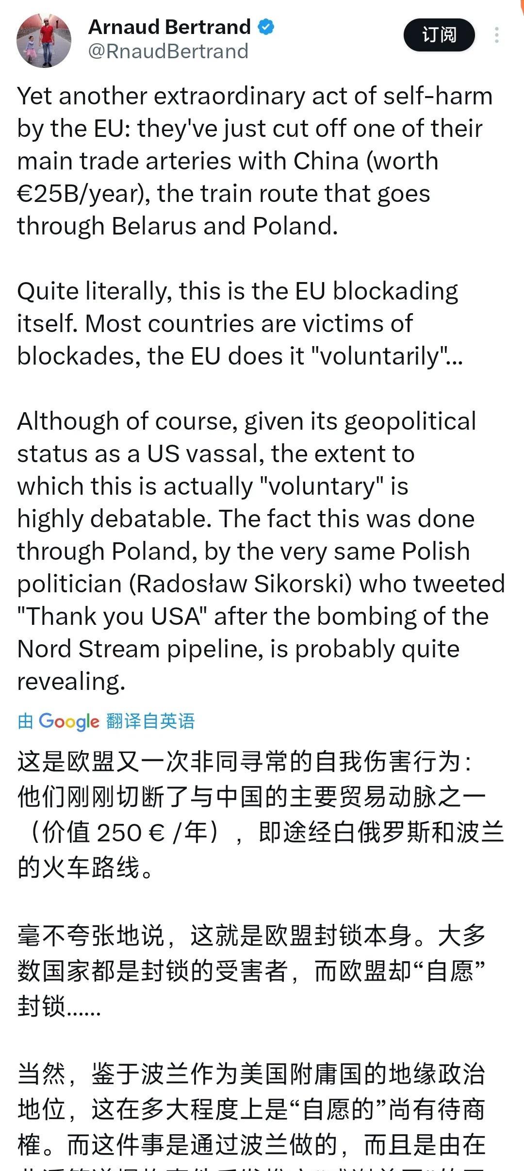 匈牙利总理欧尔班近日在一场活动上表示:“欧盟由于现任领导层的失败而处于崩溃边缘,债务堆积如山、蜂拥而至的移民、街头暴力、日益浓重的战争阴影、大规模裁员、公用事业费用飞涨、贫困的家庭、布鲁塞尔的官僚们向惊慌失措的鸡一样四处乱窜。现在的欧盟领导层就向一个坏掉的GPS导航系统,不断重新规划路线,却永远到达不了目的地。” 意大利总理梅洛尼上月底在“里米尼会议”上直言,面对中美带来的竞争力挑战,欧盟注定“上不了桌”,欧盟已经陷入地缘政治无足轻重的境地,官僚主义不会带我们走出风暴。当欧盟官僚者们高喊“独立自主”之时,他们似乎忘记了把安全外包给美国之后,欧洲早已失去了自我。布鲁塞尔压根就没有走出一位赢得世界尊重的政治人物,必然在全球重大决策中完全缺席。欧盟误将中国实力视为“威胁〞,却将美国的胁迫视为“正常关系”“合作伙伴”,于是中美又一次得出共同的结论,欧洲只是附庸而非自主。 法国著名时事评论家阿诺德.布特朗20日指出(图3),欧盟在北溪管线被炸之后又开启了一次自残行为,他们切断了中欧贸易专列线路,波兰虽是美国的附庸国,但是没有欧盟的同意,波兰不会如此胆大妄为,毕竟贸易是相互的。正在欧盟“沾沾自喜”之时,由于受原材料短缺,欧洲的汽车、消费电子以及军工业出现停工潮(图5)。 这是不是对冯德莱恩的要求或者期望值过高?她毕竟没有过治理国家的经验,让她治理诺大的欧洲也确实强人所难,所以冯德莱恩又干起国防部长的老本行。