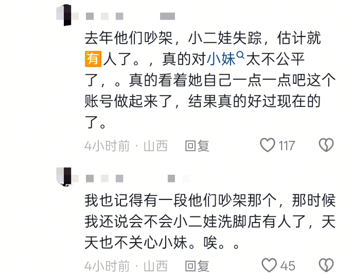 有网友跑到小妹儿的直播间,告诉她小二娃有女友的事情。小妹儿面带微笑,用调侃的语气回应网友,声称:小二娃不可能在这么短的时间内有女友,当时有网友猜疑是小二娃“对不起”小妹儿时,小妹儿当着直播间网友的面,替小二娃开脱。声称:两人离婚是因为性格不合,跟别的没有关系。最终原因是因为两人发生分歧时,小二娃选择冷处理,甚至做出离家出走的极端行为,小妹儿忍无可忍,才选择离婚。