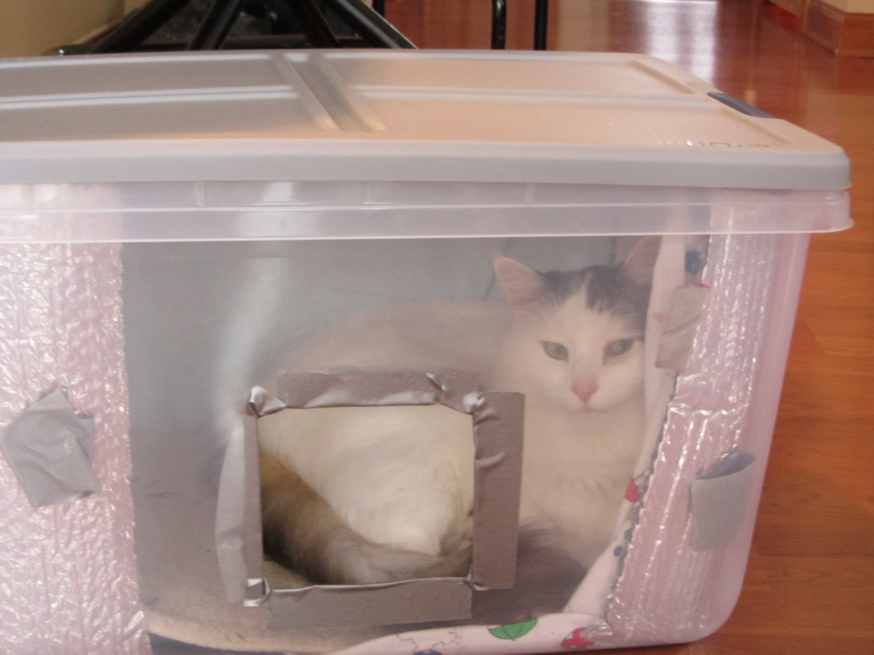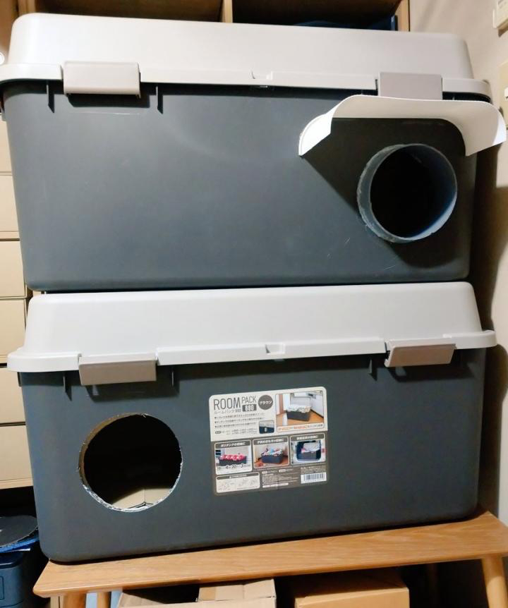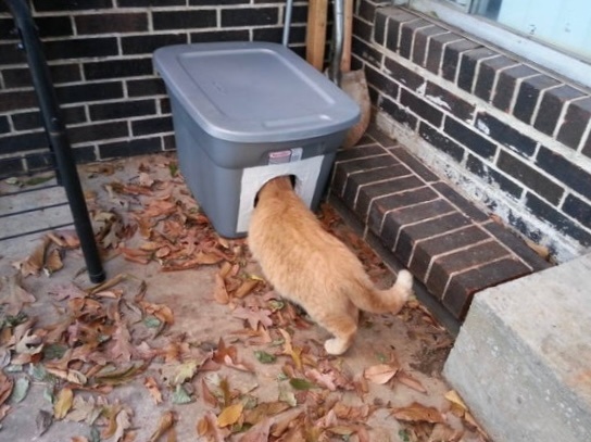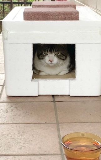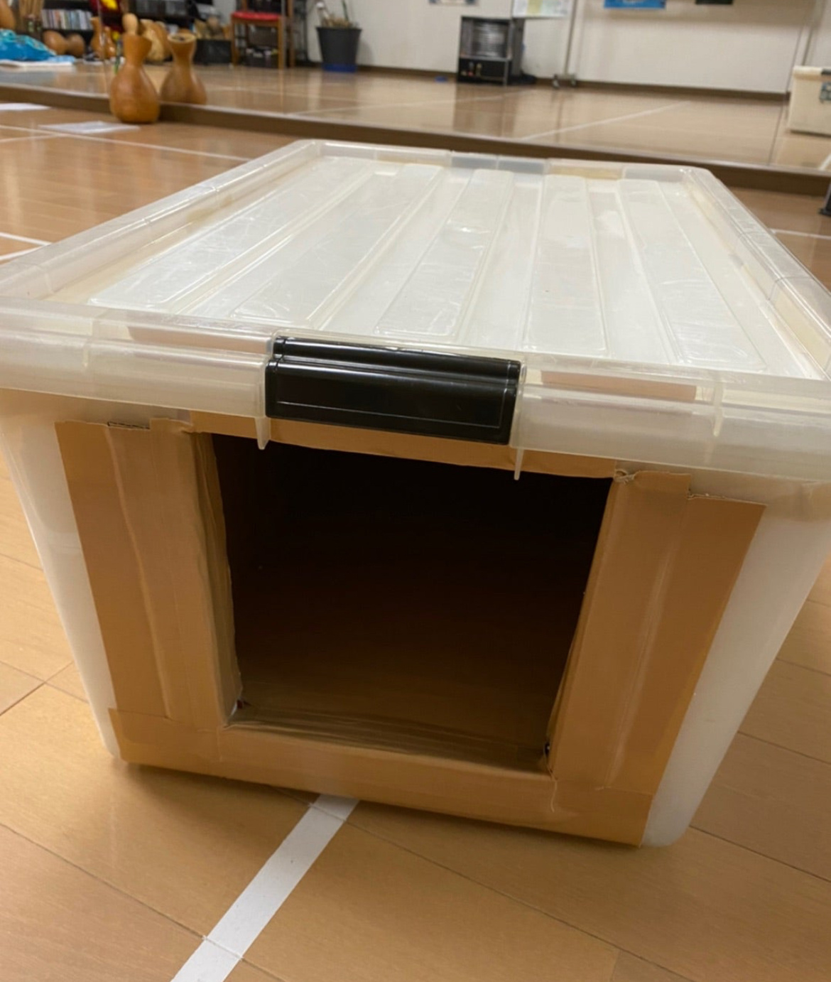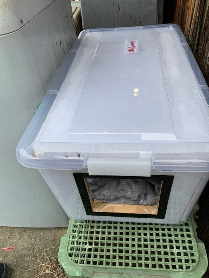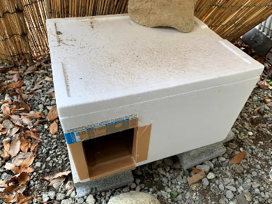 網路上搜索一些幫助流浪動物的DIY避難小屋,最好用的大概是收納箱吧,防水又防寒,底部最好能夠架高;切割過的洞口,邊緣較銳利不平整,防止被刮傷,可以在周圍包裹上泡棉或者是膠帶,上方在壓上重物(連扁平的石頭、磚塊🧱),放在靠牆邊或隱密的位置,並留下"因惡劣天氣暫放猫咪躲避屋、屆時自行清理"的字條!