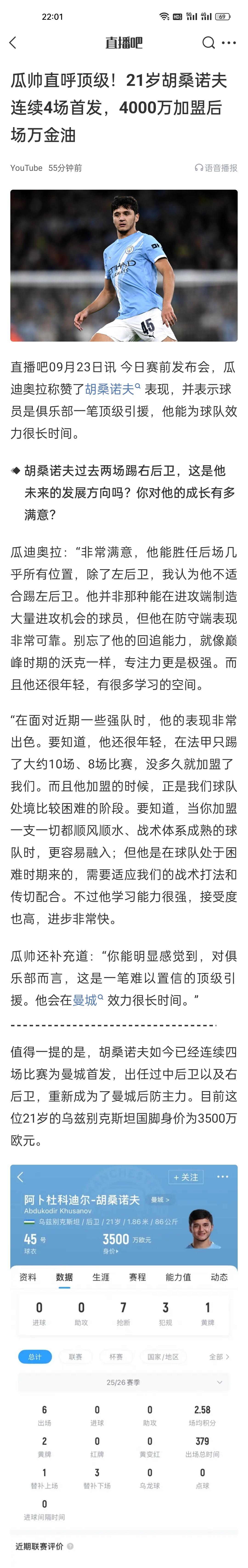 瓜帅直呼顶级!21岁胡桑诺夫连续4场首发,4000万加盟后场万金油。 速度快,防守好,拦截能力也强,进攻能力不行,他自己也不会压上,传球也一般,出现过几次传球直接被断,要么就传罗德里刀山球。 上赛季踢皇马唯一当人的,后面说是协议原因不上他,其实那一场就看出来很适合边后卫,其实他踢边卫只需要他的防守能力,其它可以忽略不计的情况下,他左右应该都是能踢的,对于大队来说这就是块宝,后场搬哪都可以,不管是考虑伤病还是轮换都因它的存在游刃有余,当然在瓜的战术里就差点意思不过现在曼城这些人也踢不了传控,还有一个问题就是他那边的边锋需要非常强的个人能力,不然没有支援作用不大,又或者像b席一样就是个中场。